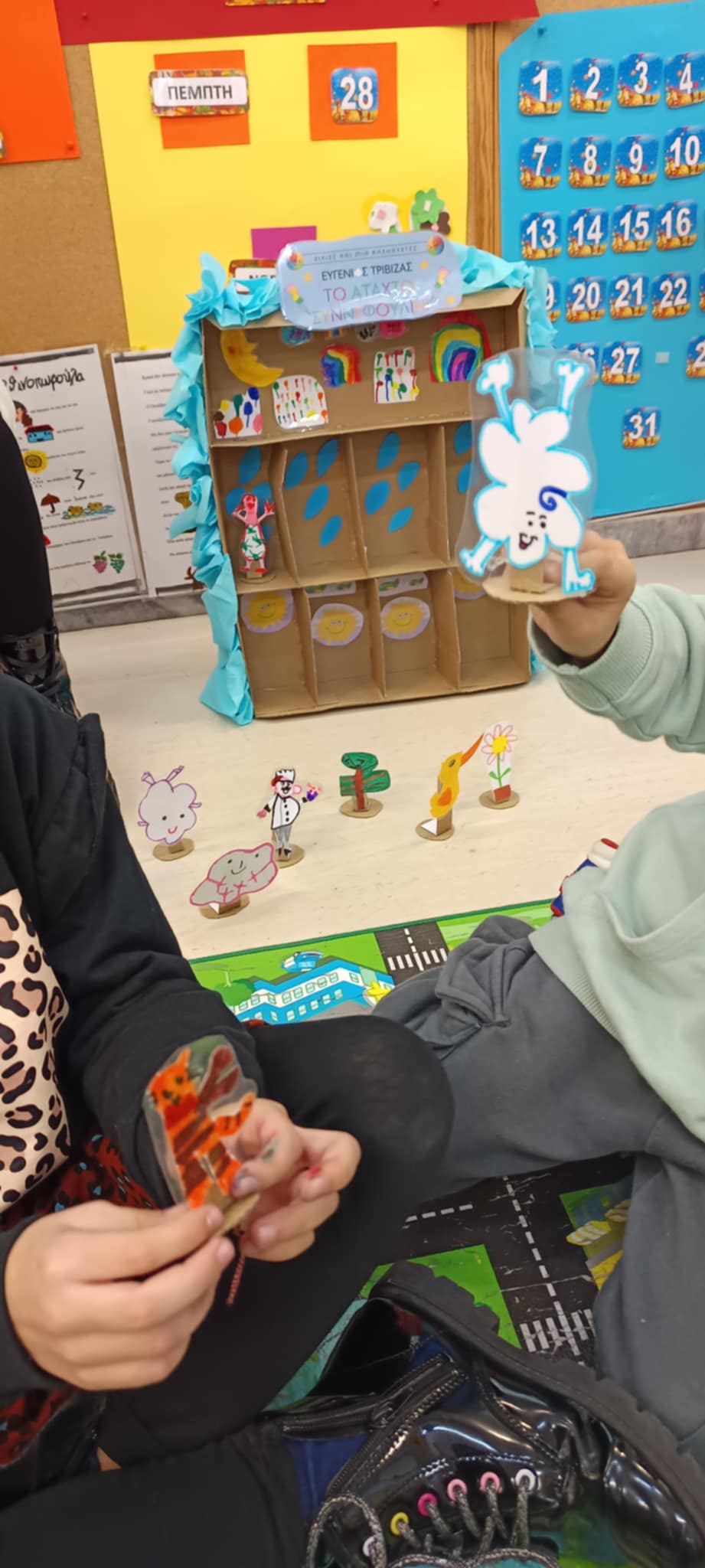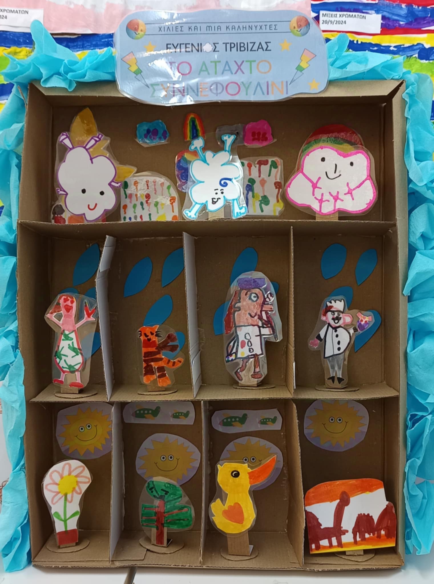 Ακόμα, διαβάσαμε το βιβλίο του Ευγένιου Τριβιζά “Το άτακτο συννεφουλίνι”. Στη συνέχεια, εμπνευστήκαμε και δημιουργήσαμε ένα τρισδιάστατο θέατρο με φιγούρες – ήρωες από την ιστορία του βιβλίου, στηριζόμενοι στις ιδέες που παρακολουθήσαμε στο σεμινάριο “Βιβλία σα θεατρικές σκηνές: Το εικονογραφημένο βιβλίο ως τρισδιάστατο θέατρο”. Στο τέλος, παίξαμε την ιστορία με τον δικό μας τρόπο, χρησιμοποιώντας την υπέροχη κατασκευή μας.