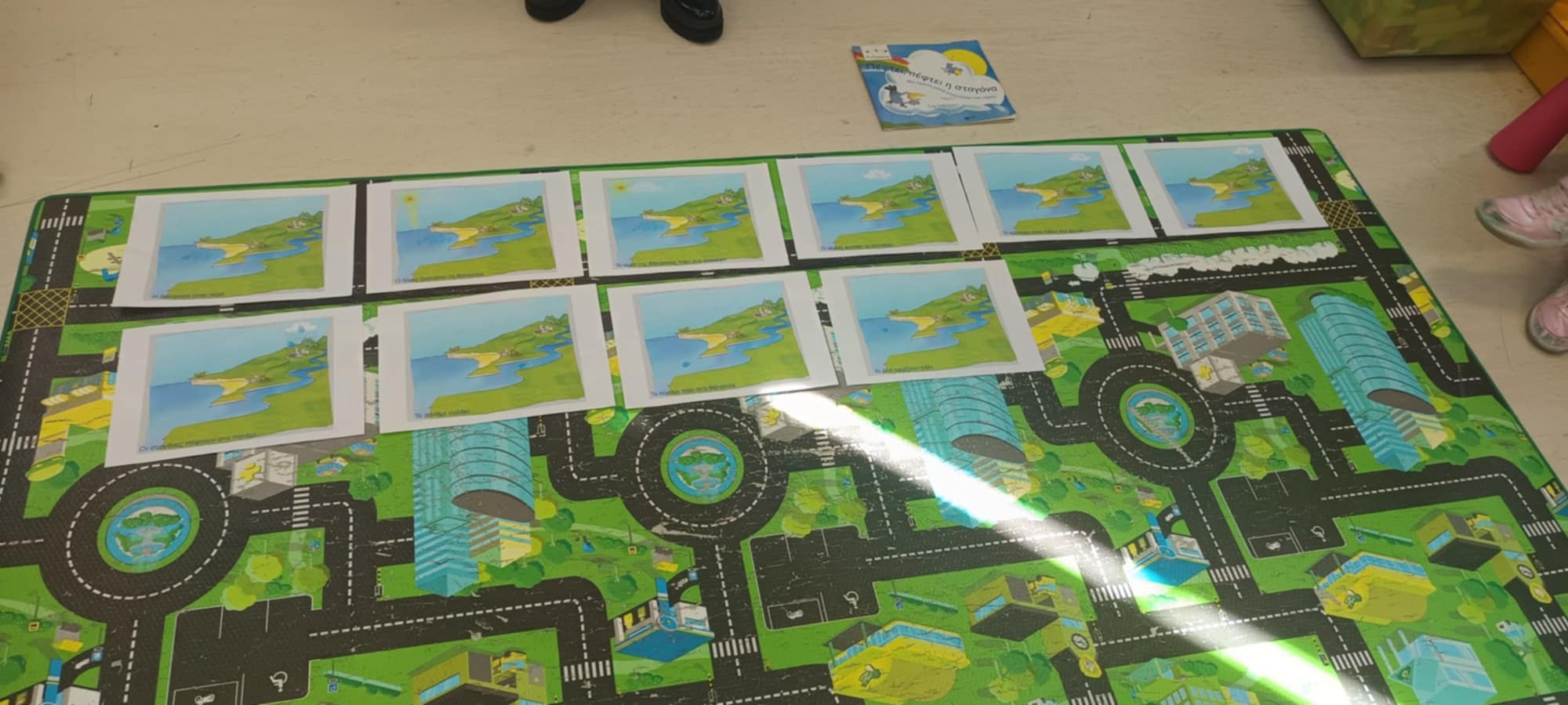 Αρχικά, διαβάσαμε το βιβλίο “Πέφτει πέφτει η σταγόνα”, έτσι ώστε να κάνουμε μία εισαγωγή στον κύκλο του νερού και να έλθουμε σε μία πρώτη επαφή με το μεγάλο και ασταμάτητο ταξίδι που κάνει το νερό στον πλανήτη μας. Έπειτα, προσπαθήσαμε να βάλουμε στη σωστή σειρά εικόνες σχετικές με τον κύκλο του νερού για να κατανοήσουμε καλύτερα τη διαδικασία.