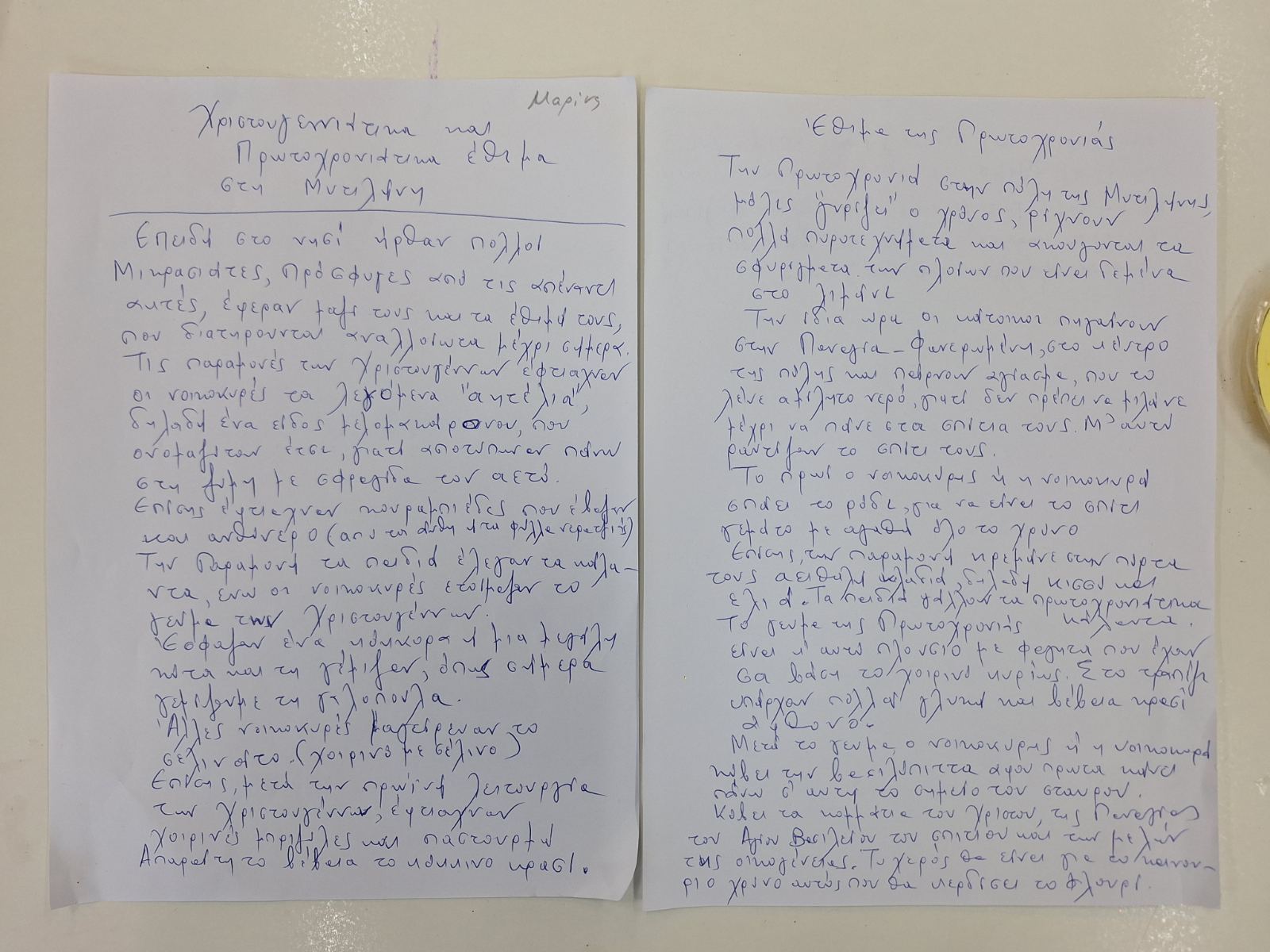 Συνεργαστήκαμε και δημιουργήσαμε τη δική μας χριστουγεννιάτικη ιστορία με τίτλο “Μία χριστουγεννιάτικη περιπέτεια”. Πιο συγκεκριμένα, συμφωνήσαμε τους ήρωες της ιστορίας, χωριστήκαμε σε ομάδες, συζητήσαμε και γράψαμε την ιστορία. Κάναμε εργαστήριο εικονογράφησης του βιβλίου που θα φτιάχναμε, δημιουργήσαμε ψηφιακό βιβλίο με την ιστορία μας και τέλος, ζωγραφίσαμε ήρωες-φιγούρες για να ζωντανέψουμε την ιστορία μας μέσα από αυτές, παρουσιάζοντάς την στην τάξη μας.