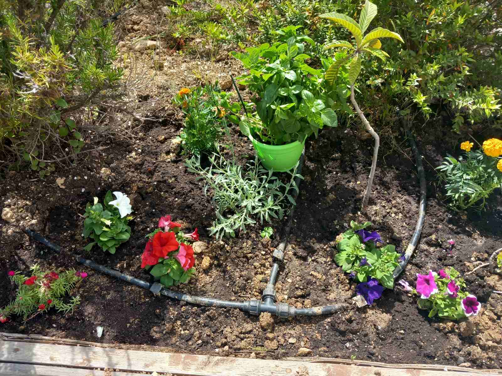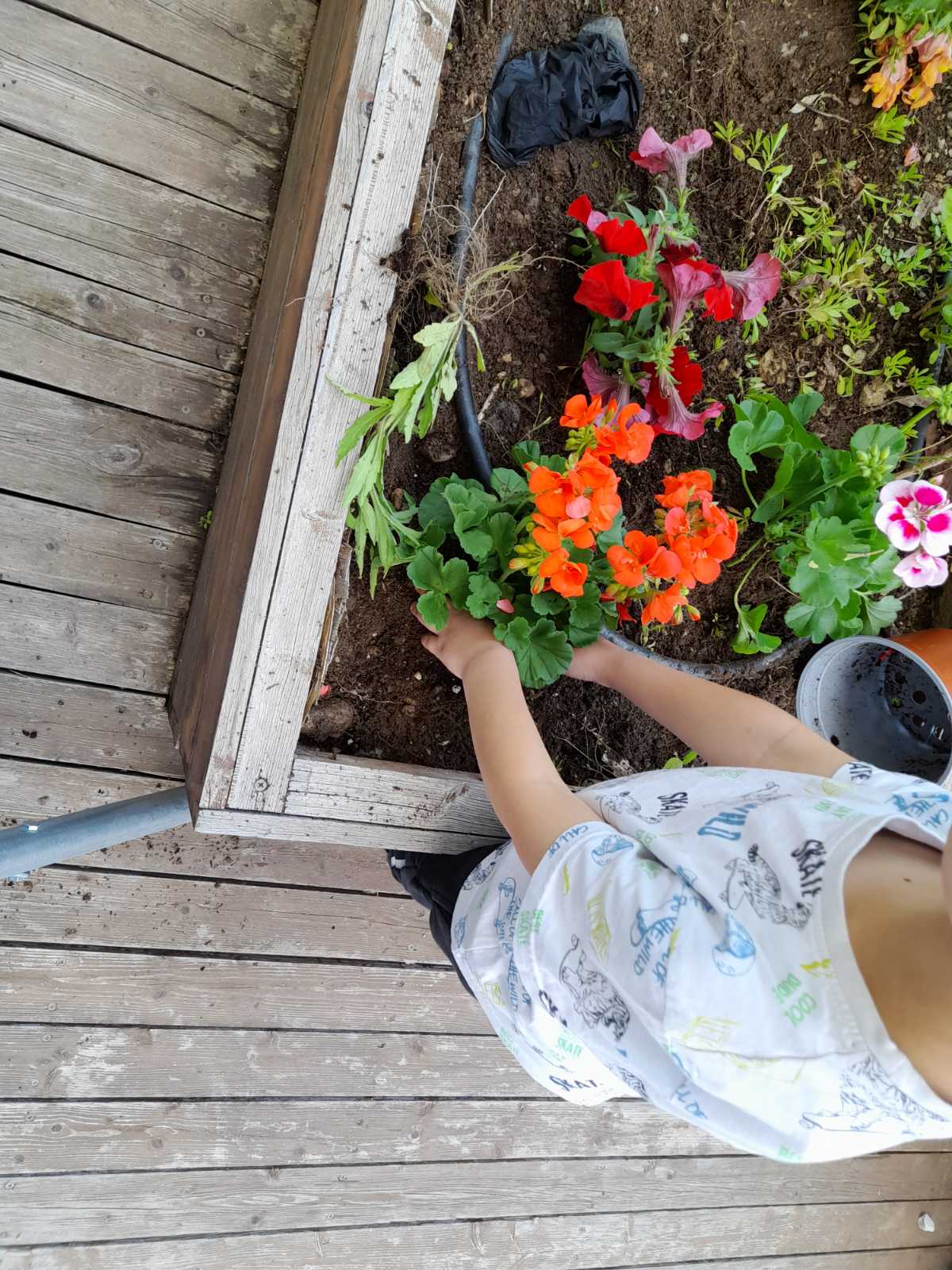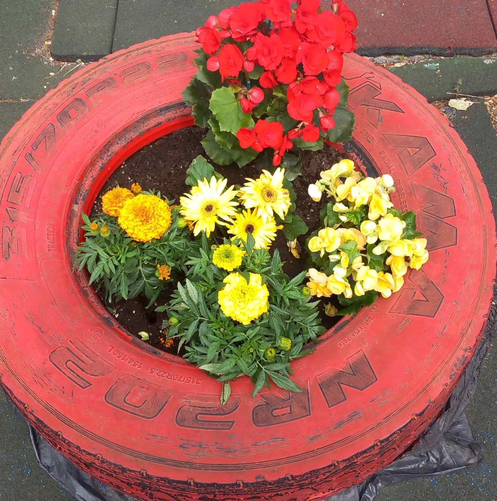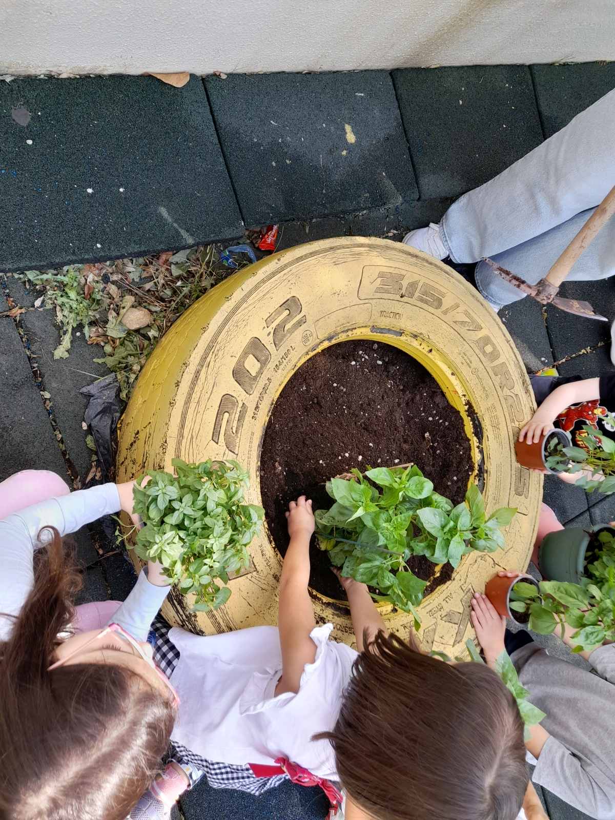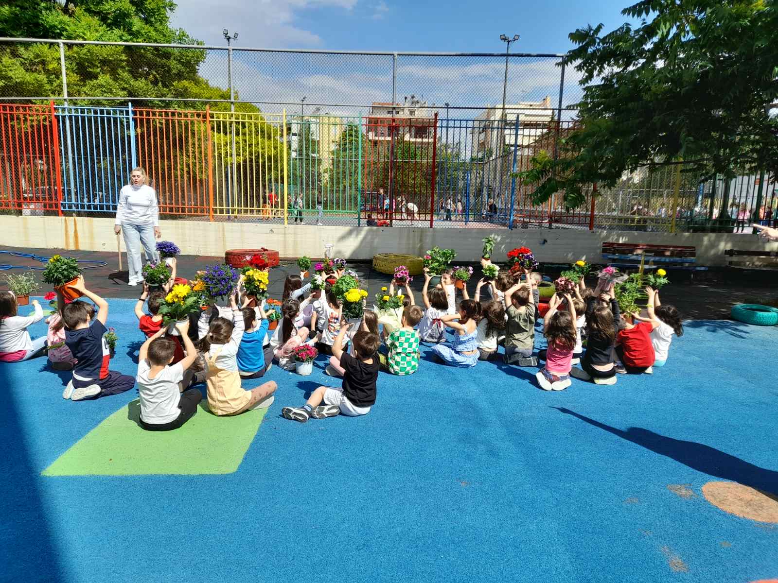 Μέσα από την Διερεύνηση της θεματικής ενότητας “Άνοιξη” προέκυψε ο καλλωπισμός της αυλής μας με λουλούδια και φυτά”. Οι γονείς ανταποκρίθηκαν με χαρά στο κάλεσμα του σχολείου και μας προμήθευσαν με λουλούδια, όπως βασιλικούς διαφόρων ειδών, κατιφέδες, ζουμπούλια, σκυλάκια, πετούνιες και άλλα. Ανανεώσαμε το χώμα στις γλάστρες-ρόδες και στα παρτέρια μας και οι μαθητές σε ρόλο κηπουρού σκάλισαν το χώμα, φύτεψαν και πότισαν. Η αυλή μας γέμισε χρώματα και ανοιξιάτικες ευωδιές.