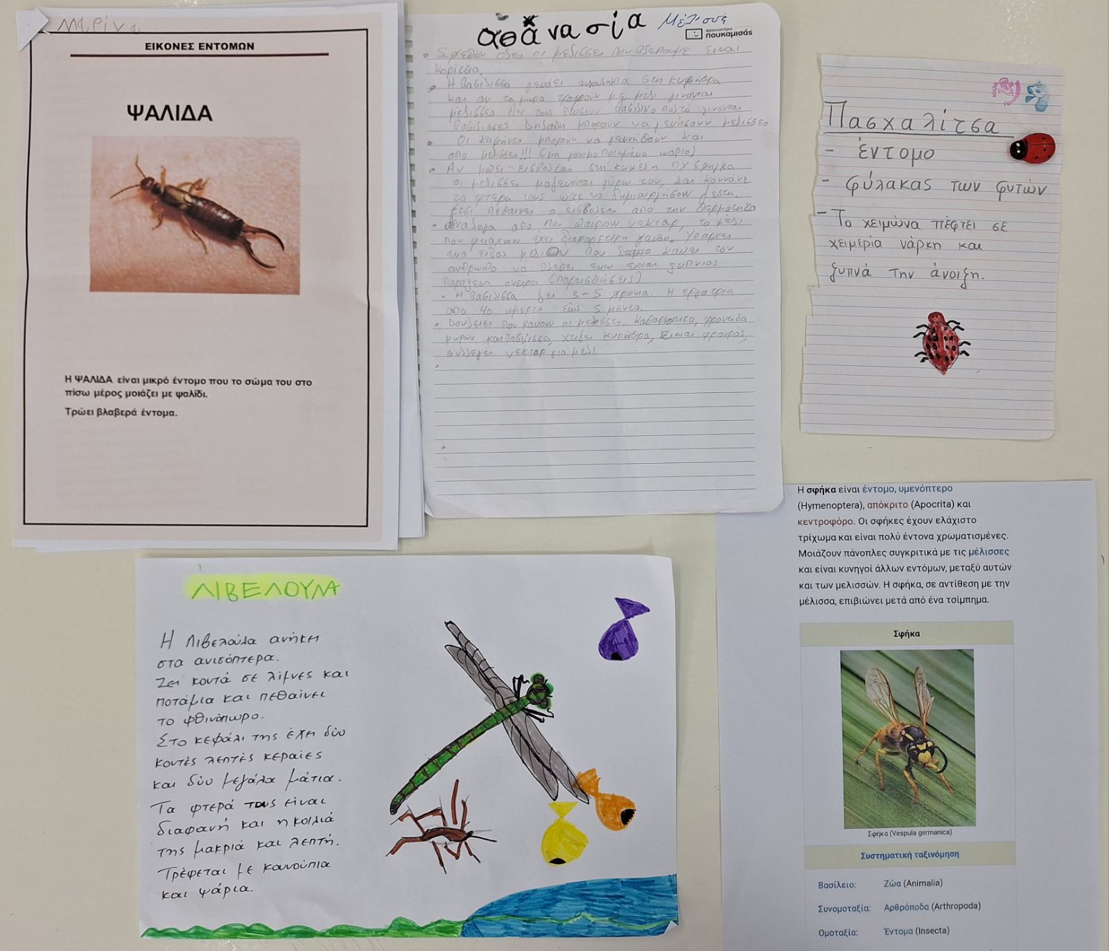Οι μαθητές αφού συζητήσαμε και συμπληρώσαμε τις στήλες “Τι ξέρω” και “Τι θέλω να μάθω” στο διάγραμμα KWLH χωρίστηκαν σε ομάδες ανάλογα με έντομο που επίλεξαν,