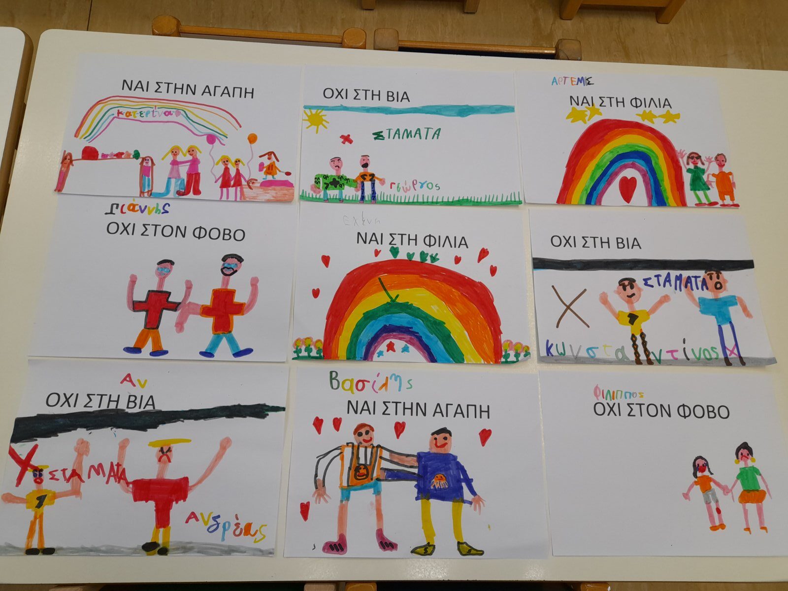 Δημιουργήσαμε τα δικά μας πανό και πλακάτ με συνθήματα κατά της βίας και υπέρ της αγάπης και της φιλίας. Τα παρουσιάσαμε στους γονείς φωνάζοντας συνθήματα και κάνοντας την δική μας διαδήλωση.
