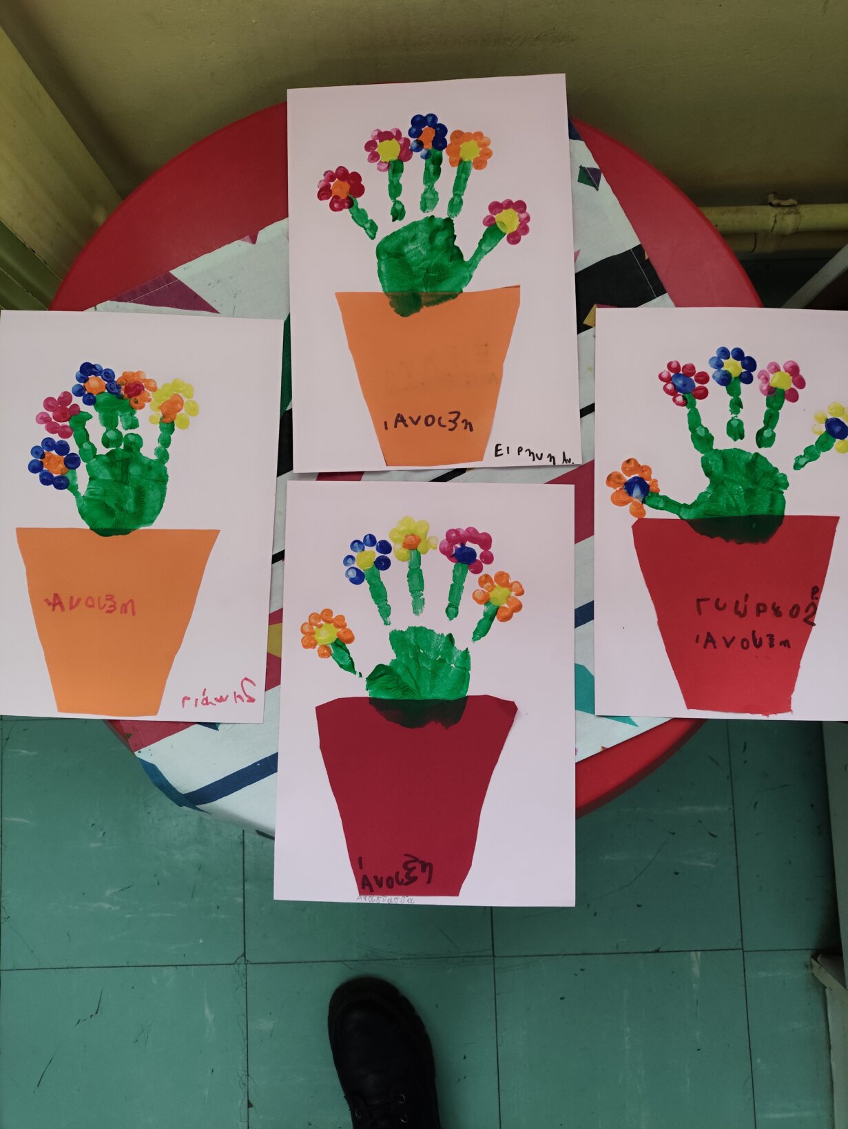 Και γλαστρακια με αποτύπωμα παλάμης και πέταλα από τα μικρά δαχτυλάκια μας