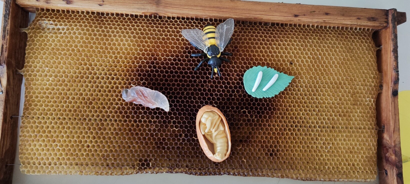 Μάθαμε επίσης για τον μαγικό κόσμο των μελισσών: είδαμε από κοντά την κυψέλη, παρατηρήσαμε με τον μεγεθυντικό φακό το σώμα της, γνωρίσαμε τον κύκλο ζωής της!