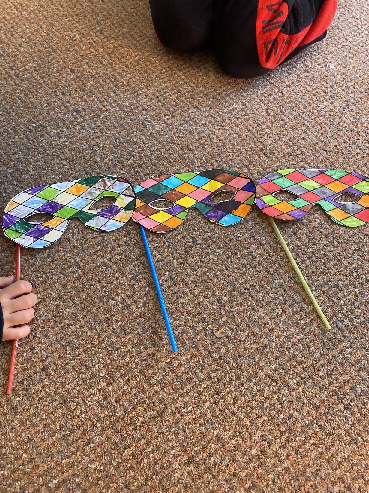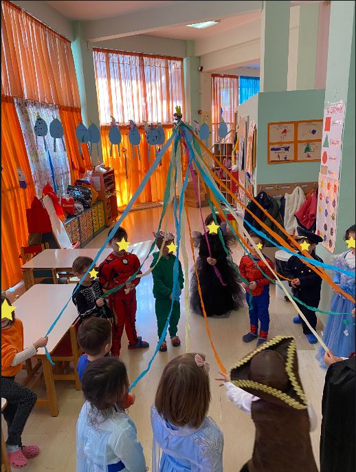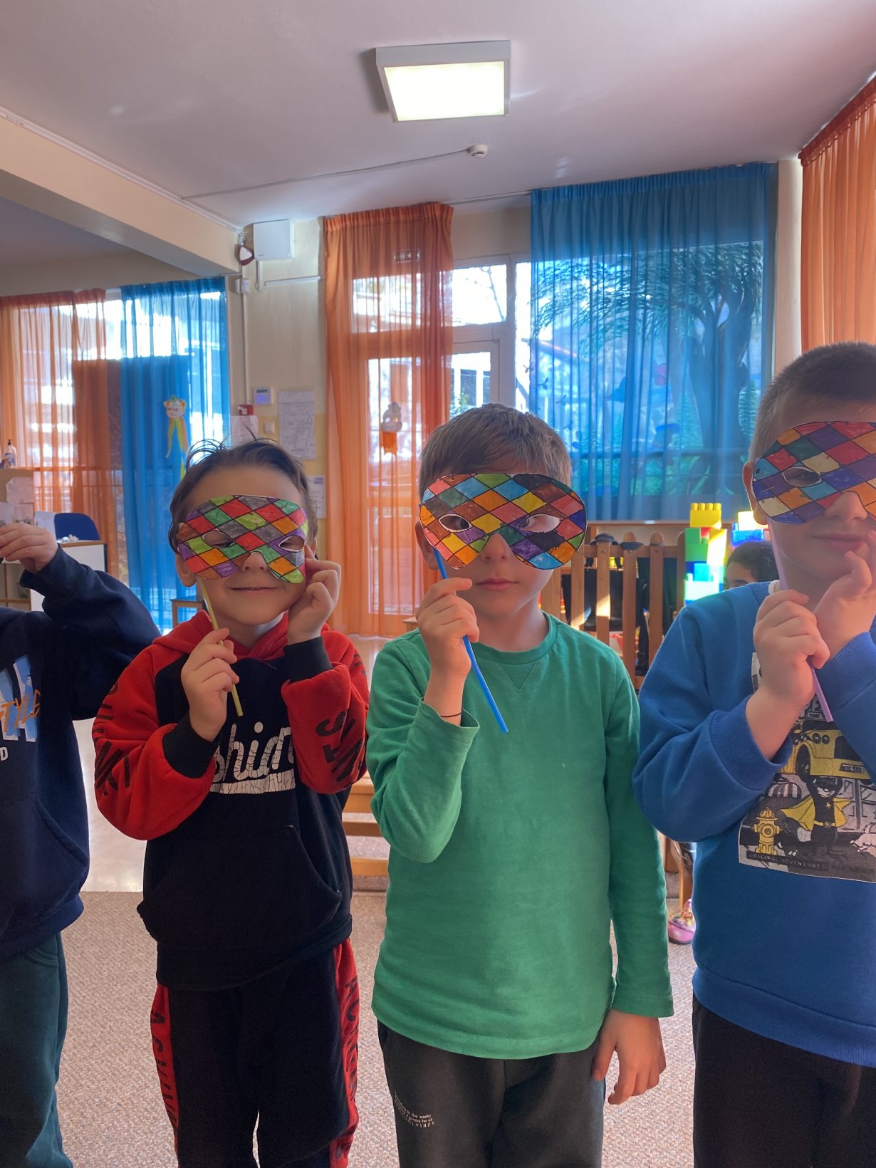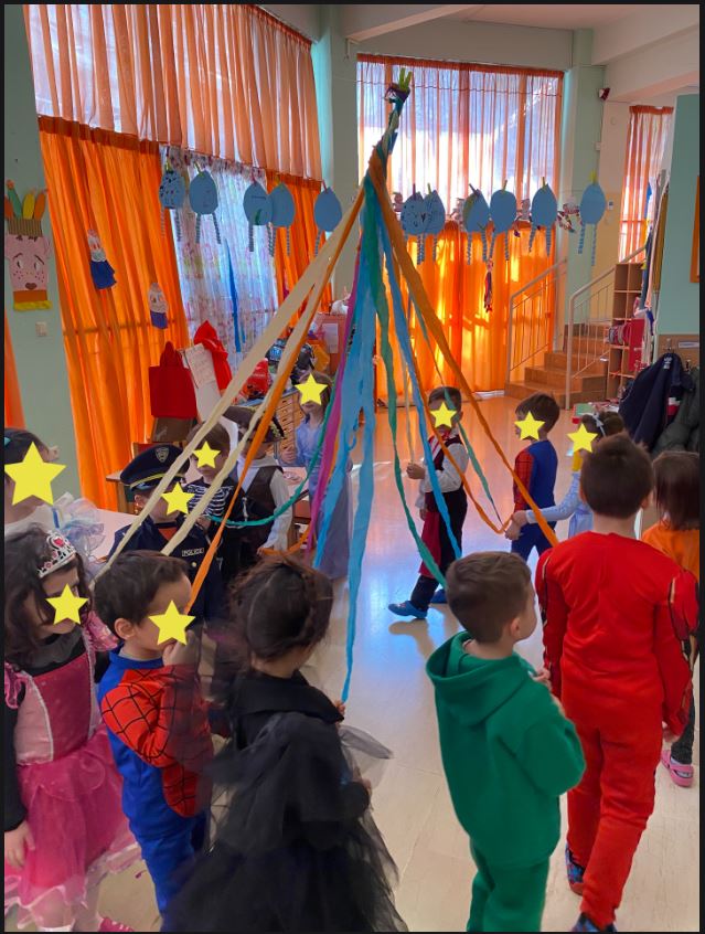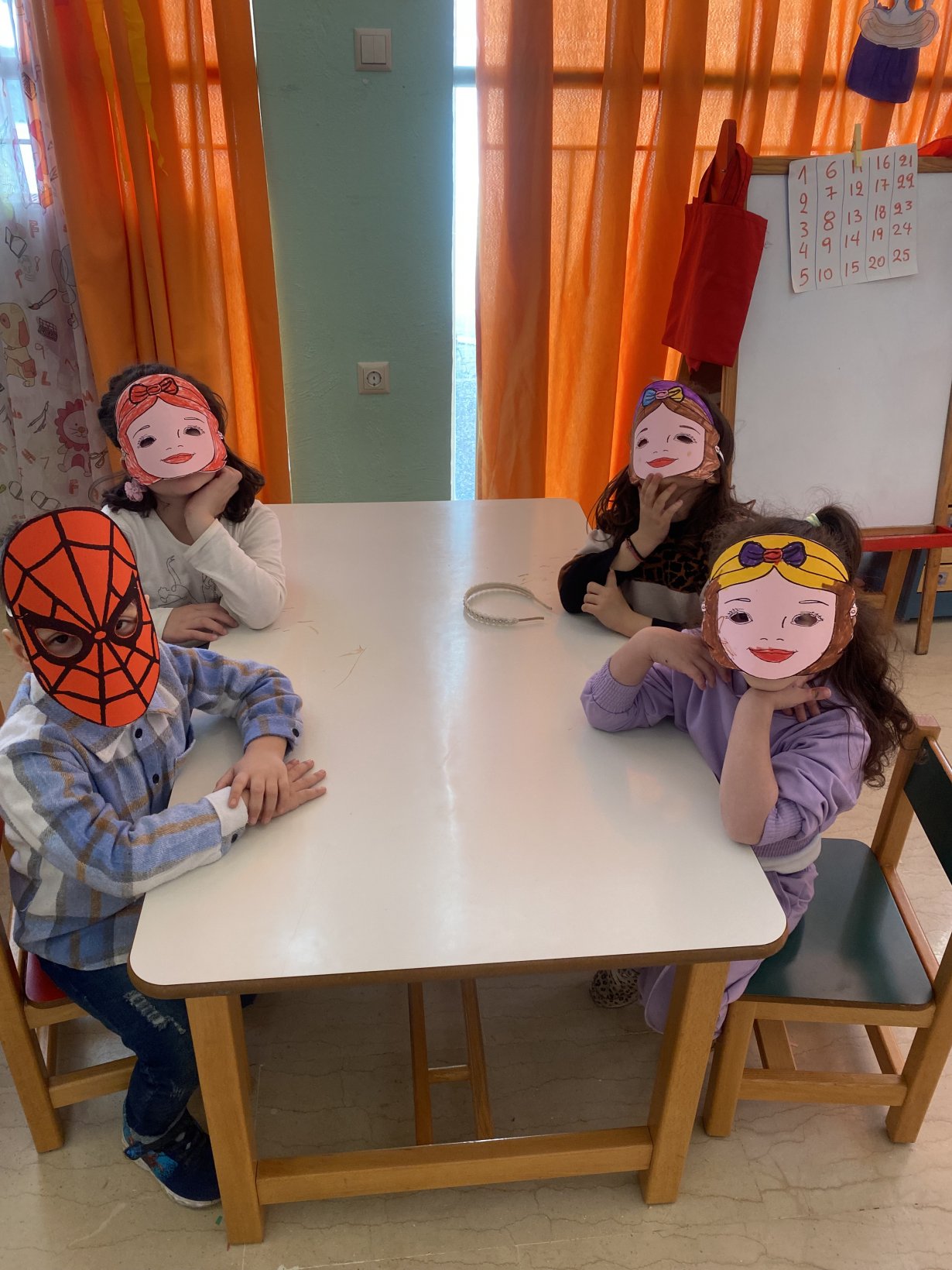 Στην προσπάθεια μας να μυήσουμε τα παιδιά στα αποκριάτικα έθιμα και τις παραδόσεις του τόπου μας και να τα εισάγουμε στο κλίμα των ημερών στήσαμε τραπέζι, φτιάξαμε μάσκες, τραγουδήσαμε και χορέψαμε με αποκριάτικα τραγούδια. Επίσης αναπαραστήσαμε γαϊτανάκι το παραδοσιακό έθιμο της Αποκριάς.