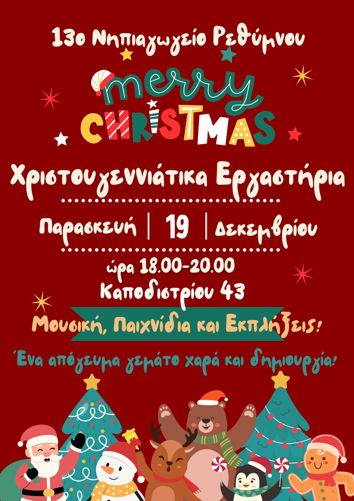 χριστουγεννιάτικη γιορτή του νηπιαγωγείου μας, η οποία θα πραγματοποιηθεί την Παρασκευή 19 Δεκεμβρίου, από τις 18:00 έως τις 20:00.