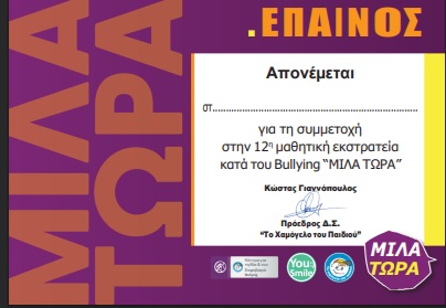 Βεβαίωση συμμετοχής για το διαγωνισμό «Λέμε ΟΧΙ στον Διαδικτυακό Εκφοβισμό: Μαθαίνουμε, Προστατευόμαστε, Στηρίζουμε!» |