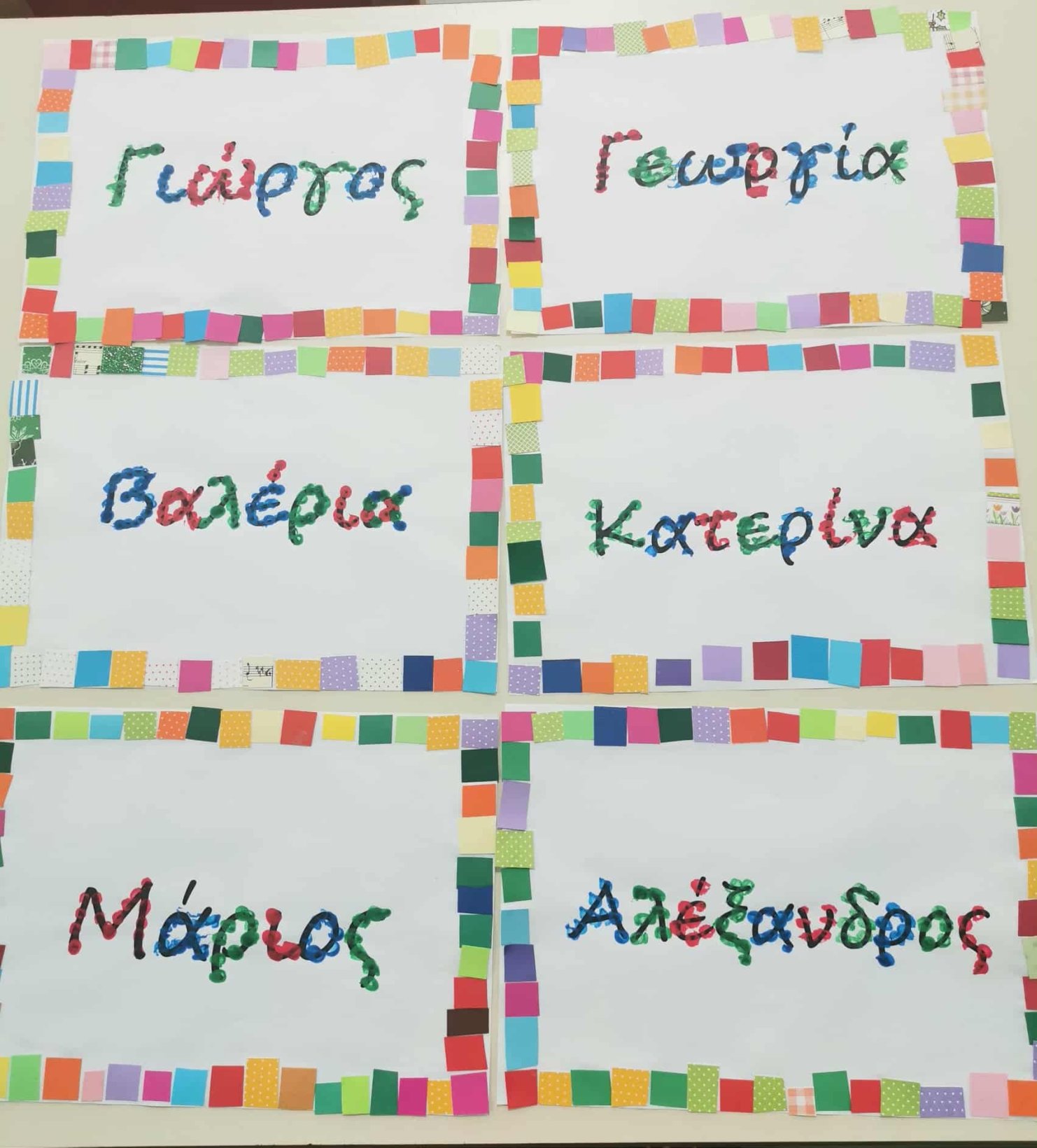 Λεπτή κινητικότητα: Τεχνική πουαντιγιέ για το όνομα. Κάδρο από πολύχρωμα χαρτάκια.