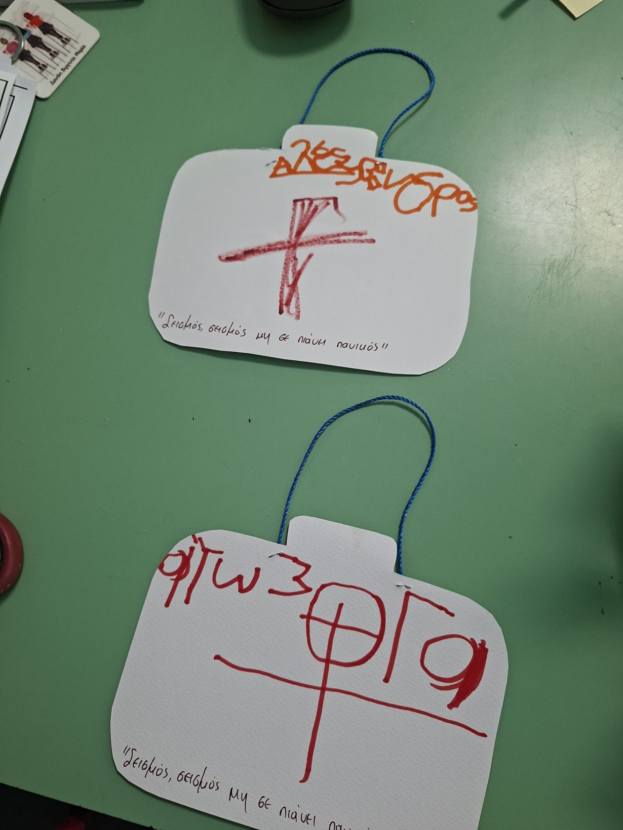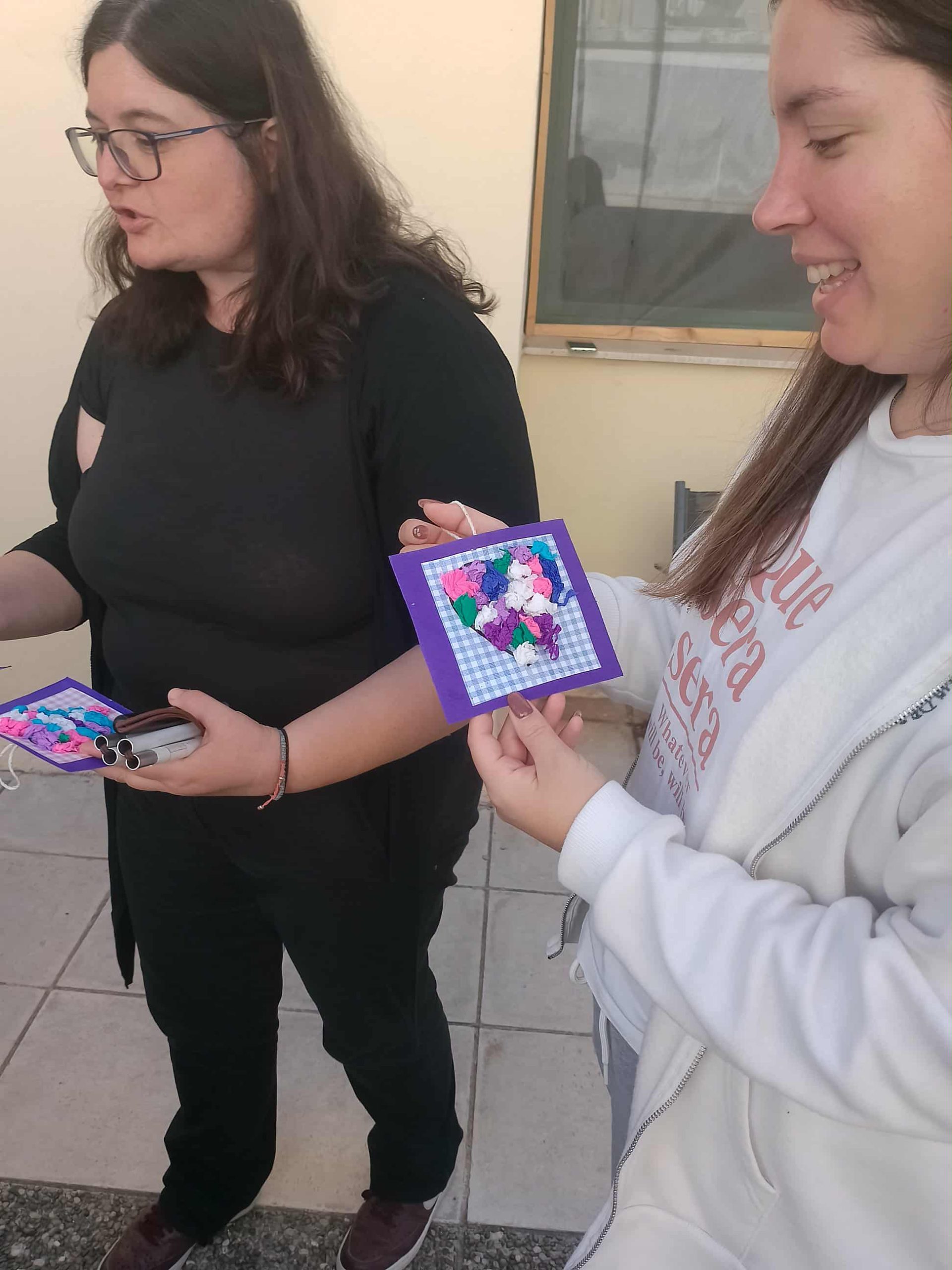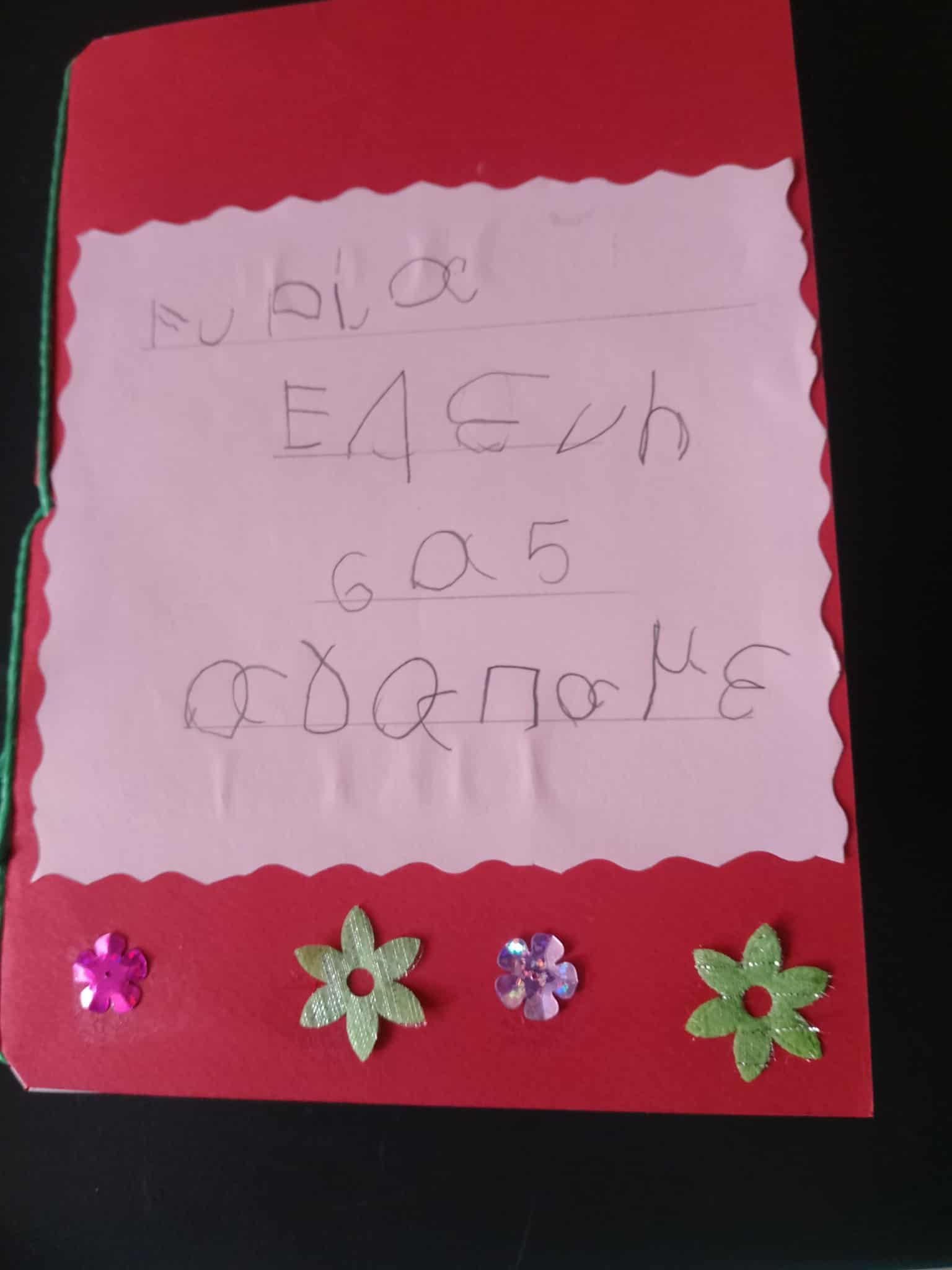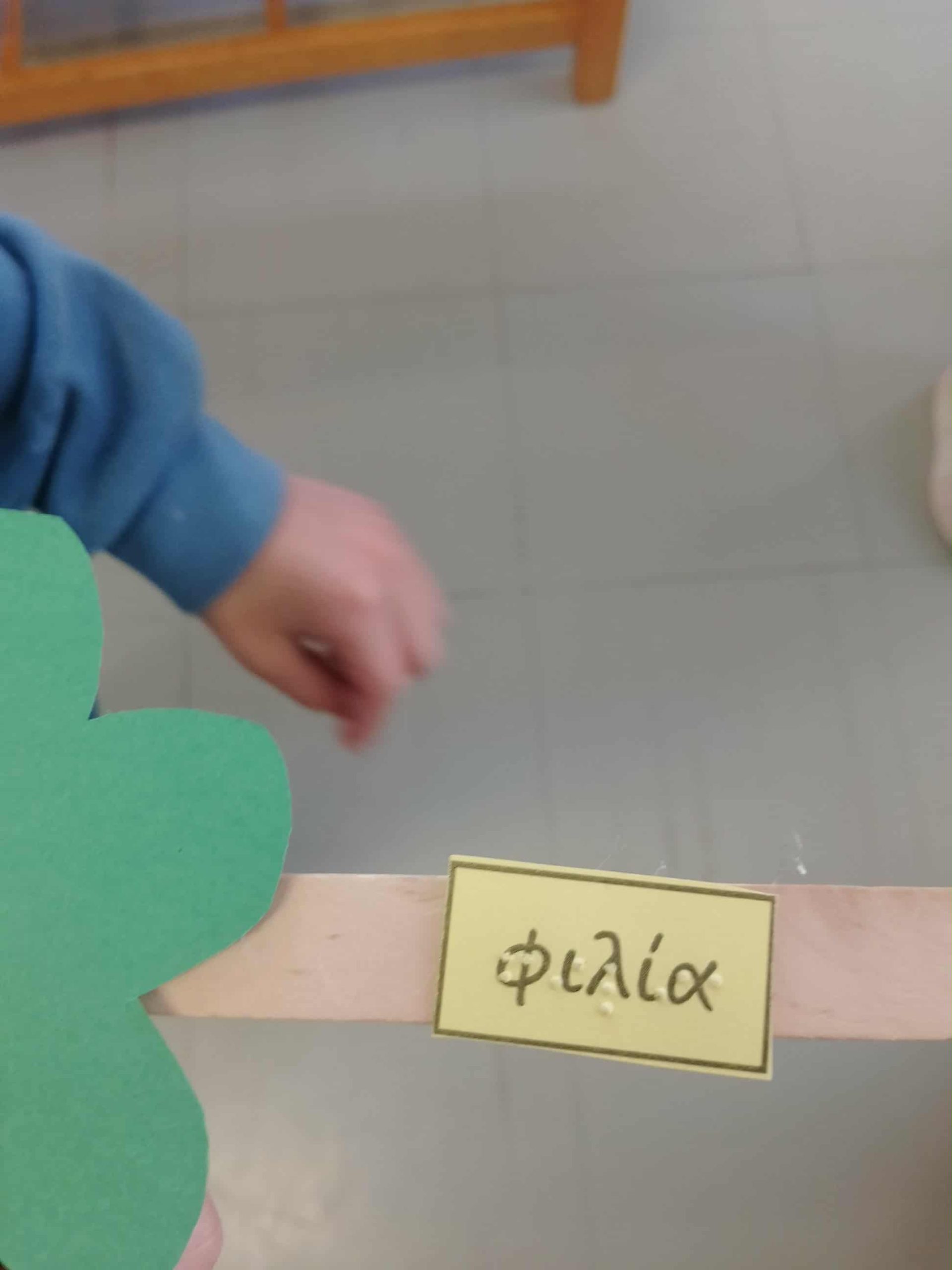 Πριν φύγουμε, χαρίσαμε στην κα Εμμανουέλα και στο διδακτικό προσωπικό ένα πήλινο πιατάκι με ανάγλυφες παραστάσεις και χάρτινες καρδιές όμοιες με τις κουκκίδες της γραφής Braille.Τα παιδιά του ΚΕΑΤ μας χάρισαν καρτέλες με τα ονόματά μας και λουλούδια με τις λέξεις ” Αγάπη” και ” Φιλία” γραμμένα και στις δύο γλώσσες