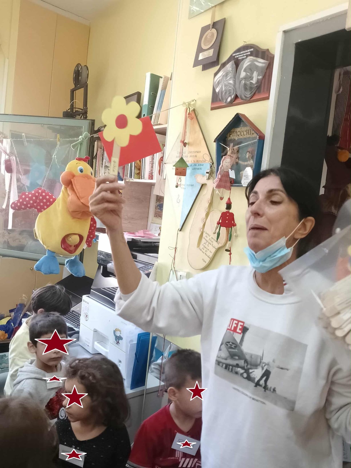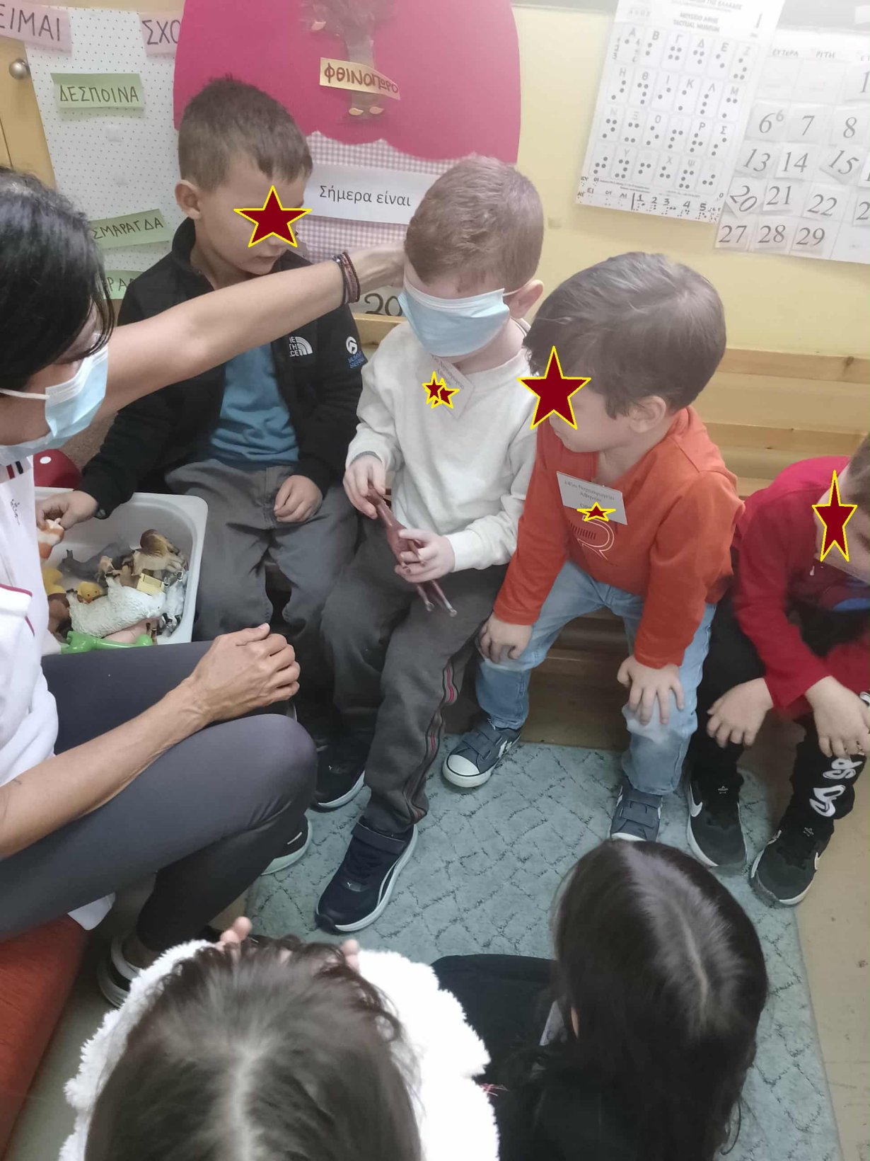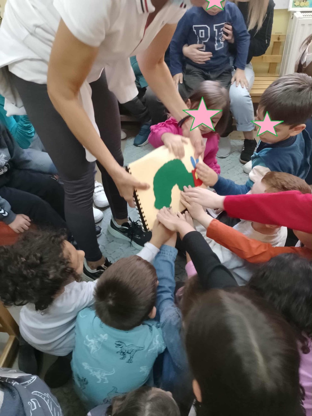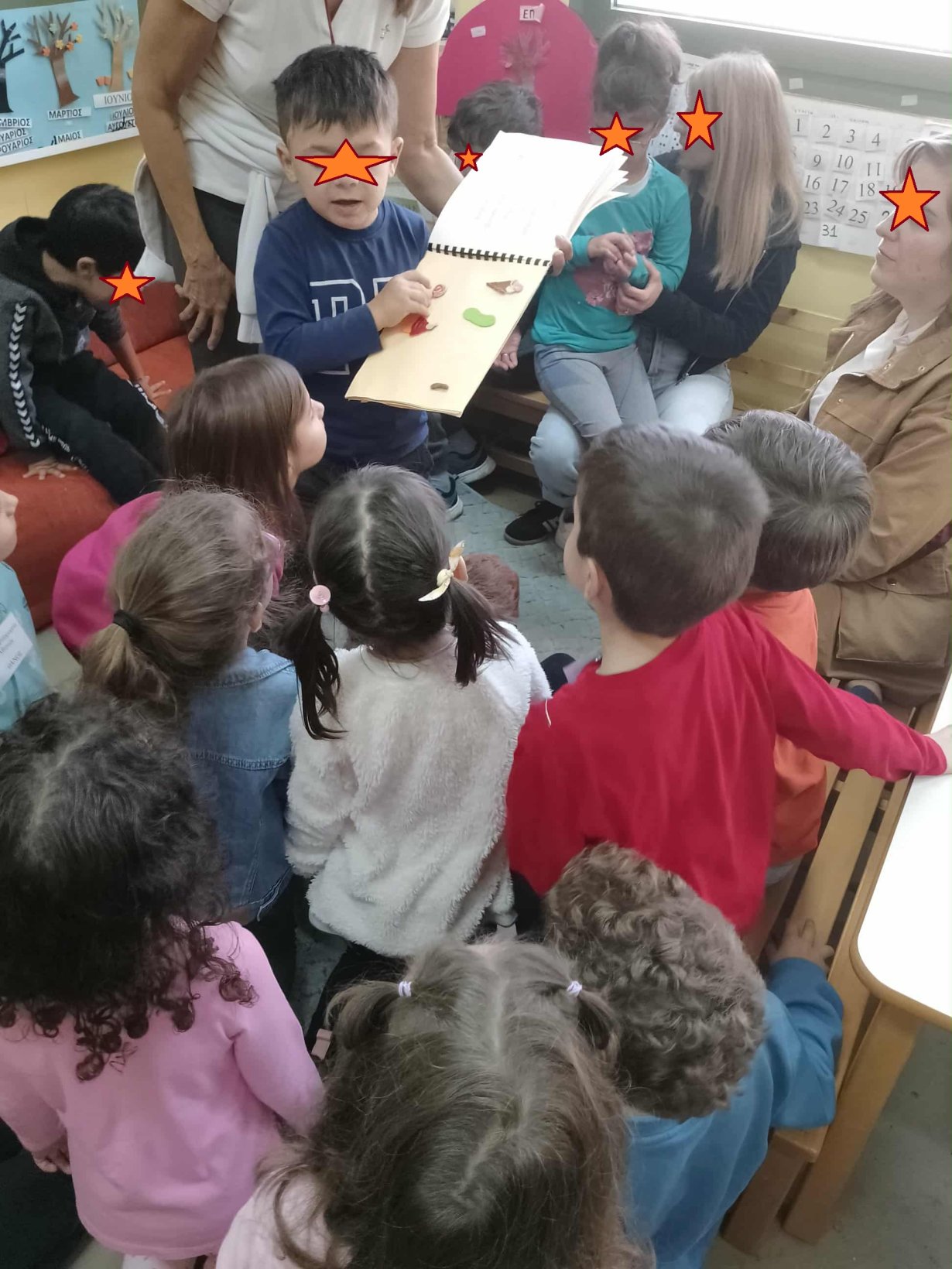 Ο Θ. μας ” διάβασε” με τον υπέροχο τρόπο του το βιβλίο που είχε φτιάξει με τους συμμαθητές του για μία κάμπια ( ” Μια κάμπια πολύ πεινασμένη” του Έρικ Καρλ, εκδ. Καλειδοσκόπιο) , χαϊδεύοντας τα ανάγλυφα υλικά και χαρτόνια που είχαν χρησιμοποιήσει για την εικονογράφησή του. Στη συνέχεια, πλησίασε τα παιδιά και τα άγγιξε φιλικά ζητώντας να μάθει τα ονόματά τους . Φεύγοντας από την τάξη είπε ότι χάρηκε πολύ που μας γνώρισε!!