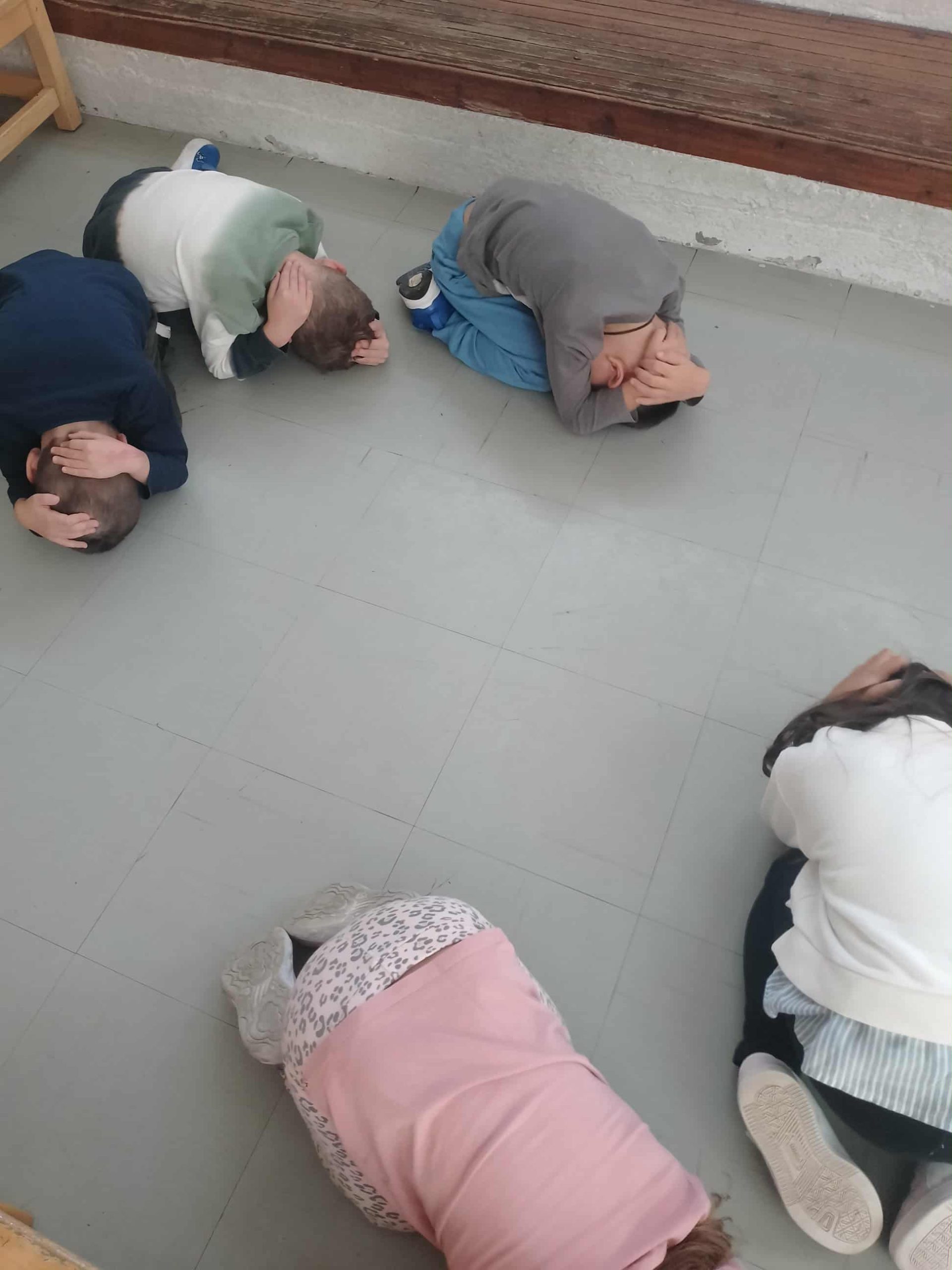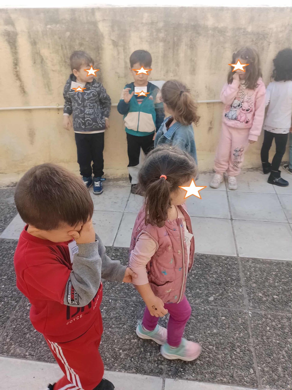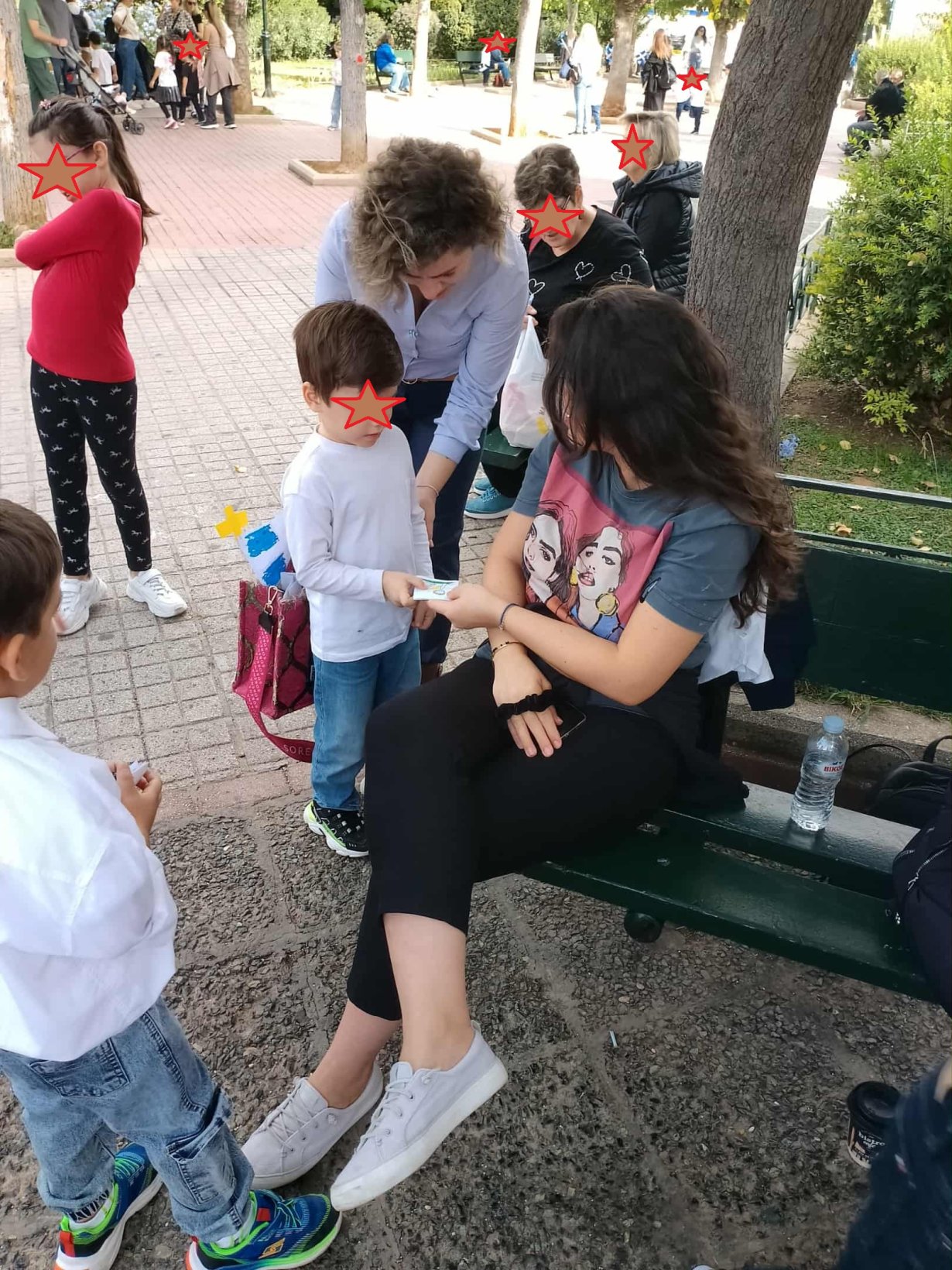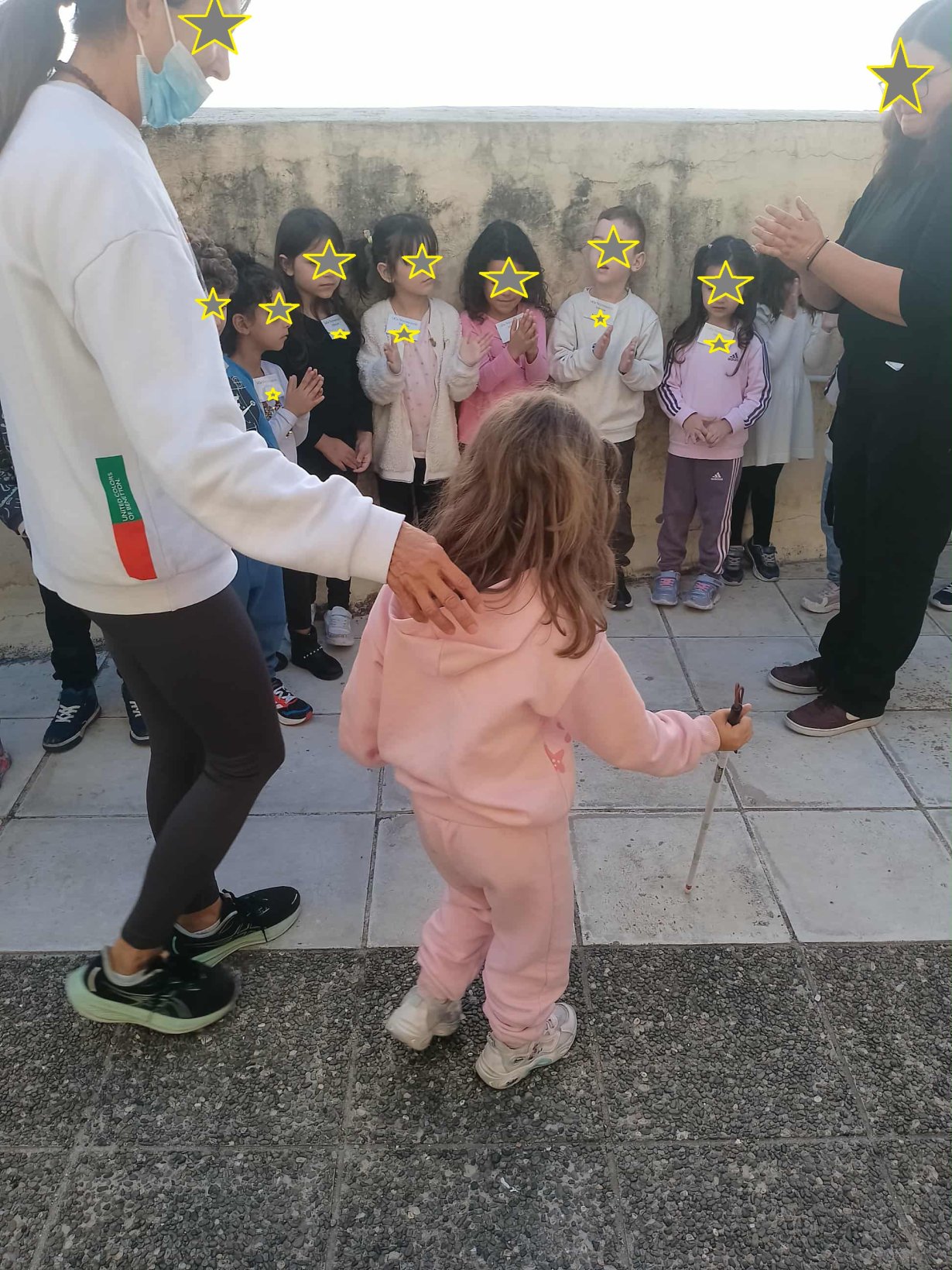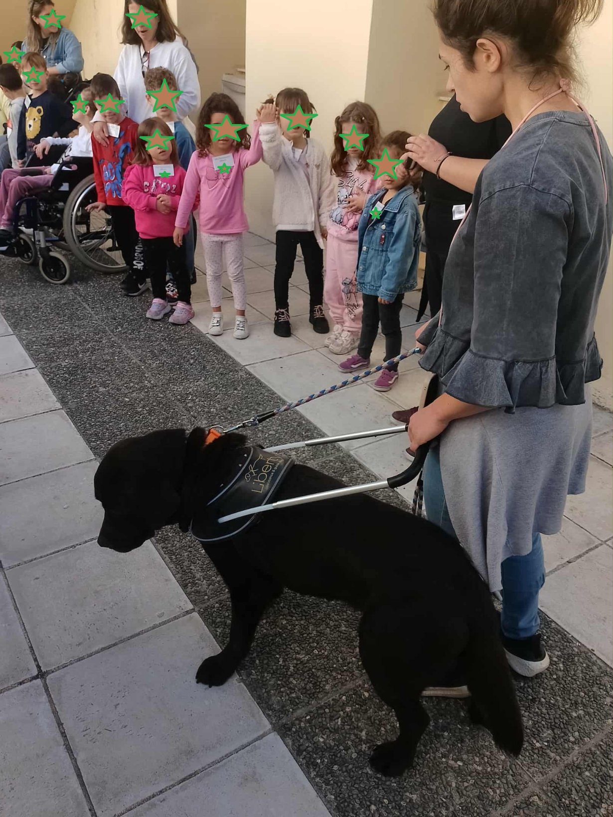Στη συνέχεια , μας έκανε μια επίδειξη του τρόπου με τον οποίο ο σκύλος συνεργάζεται μαζί της και την προστατεύει από διάφορα εμπόδια στο δρόμο της. Τα παιδιά περπάτησαν με τη βοήθεια του λευκού μπαστουνιού και έγιναν ζευγάρια όπου ο τυφλός κρατούσε από το μπράτσο τον συνοδό του προκειμένου να νιώθει ασφαλής .