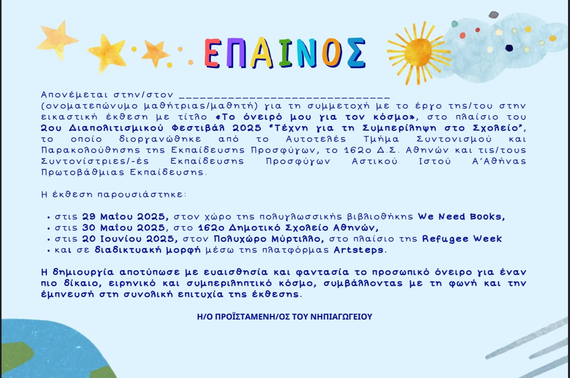 Ένα μεγάλο ” Ευχαριστώ” στις κυρίες Μαρία( Προϊσταμένη) , Μελίνα, Εμμανουέλα, Δήμητρα από το Ειδικό Δ. Σ. Τυφλοκωφών και τις κυρίες Νικολίτσα ( Προϊσταμένη),Ελένη,Βασιλική, από το Ειδικό Νηπιαγωγείο Τυφλών για τη ζεστή υποδοχή και φιλοξενία τους.