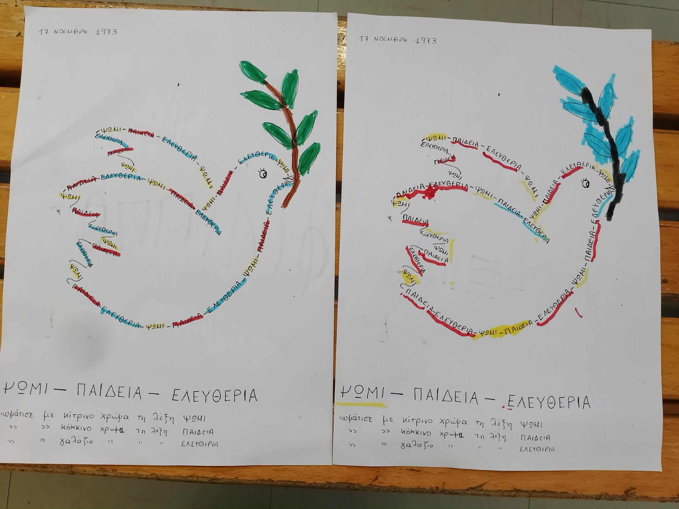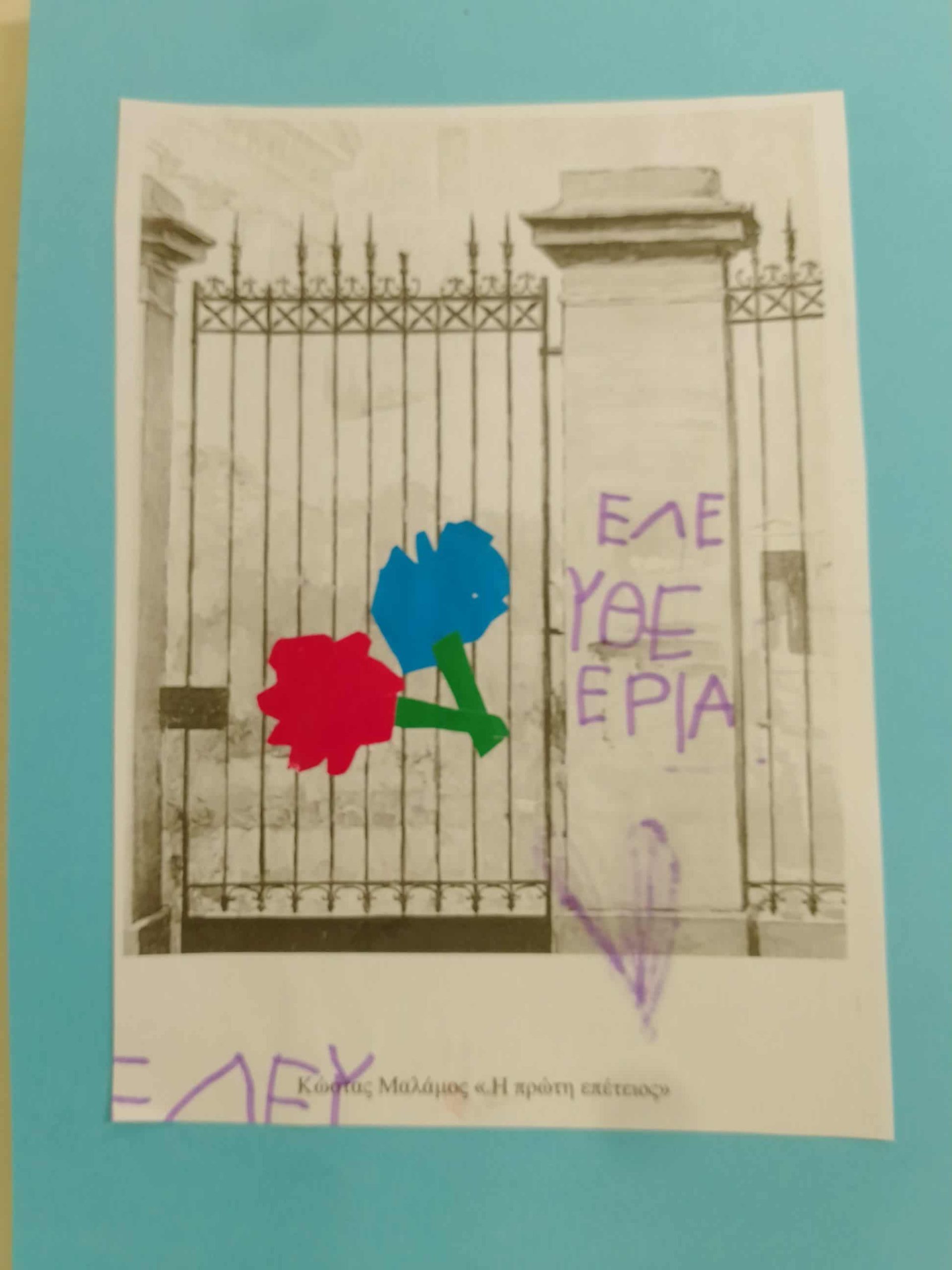 Τα παιδιά για να τον ευχαριστήσουν του φτιάχνουν σε τύπωμα το τανκ με τη γκρεμισμένη πόρτα του Πολυτεχνείου γεμάτη με λουλούδια και το σύνθημα ” Ψωμί , Παιδεία, Ελευθερία”…