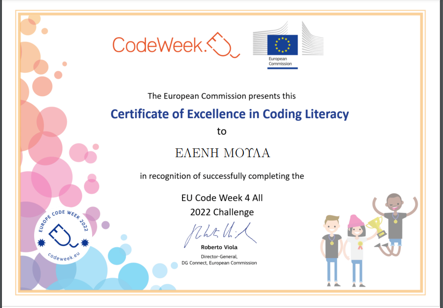 για τη δράση που υλοποίησε το Νηπιαγωγείο μας “Τοποθέτησε τα κατοικίδια ζωάκια στη φάρμα”κατά τη διάρκεια Eu code week 4 all 2023, έλαβε το πιστοποιητικό αριστείας!
