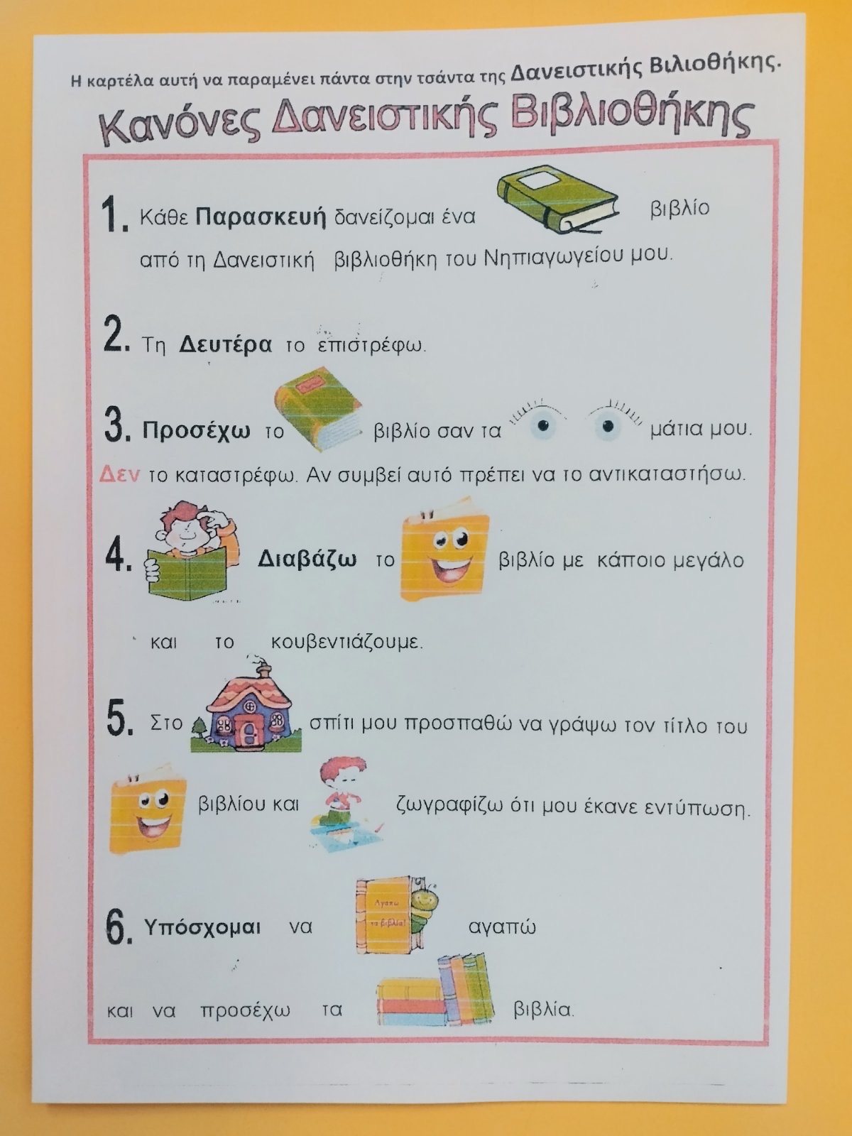 Κάθε εβδομάδα οι μαθητές θα δανείζονται ένα βιβλίο το οποίο συνοδεύεται από φύλλο εργασίας έτσι ώστε να ζωγραφίζουν αυτό που τους άρεσε. Τα παιδιά έβαλαν το βιβλίο στην τσάντα τους και πλέον ήταν έτοιμα να ξεκινήσουν το ταξίδι τους στην γνώση, την φαντασία και την περιπέτεια!!