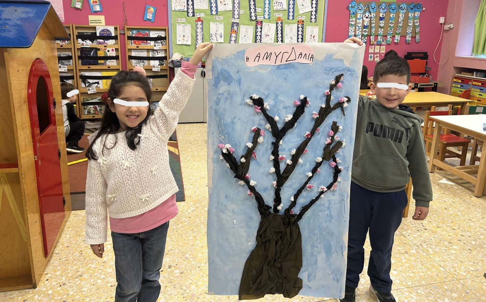 Τέλος, ασχοληθήκαμε με την αμυγδαλιά, που είναι το πρώτο δέντρο που ανθίζει και μας φέρνει την Άνοιξη. Διαβάσαμε το μύθο της, παρατηρήσαμε τα άνθη και τους καρπούς της και φτιάξαμε μια ομαδική κατασκευή με τη δική μας ανθισμένη αμυγδαλιά!