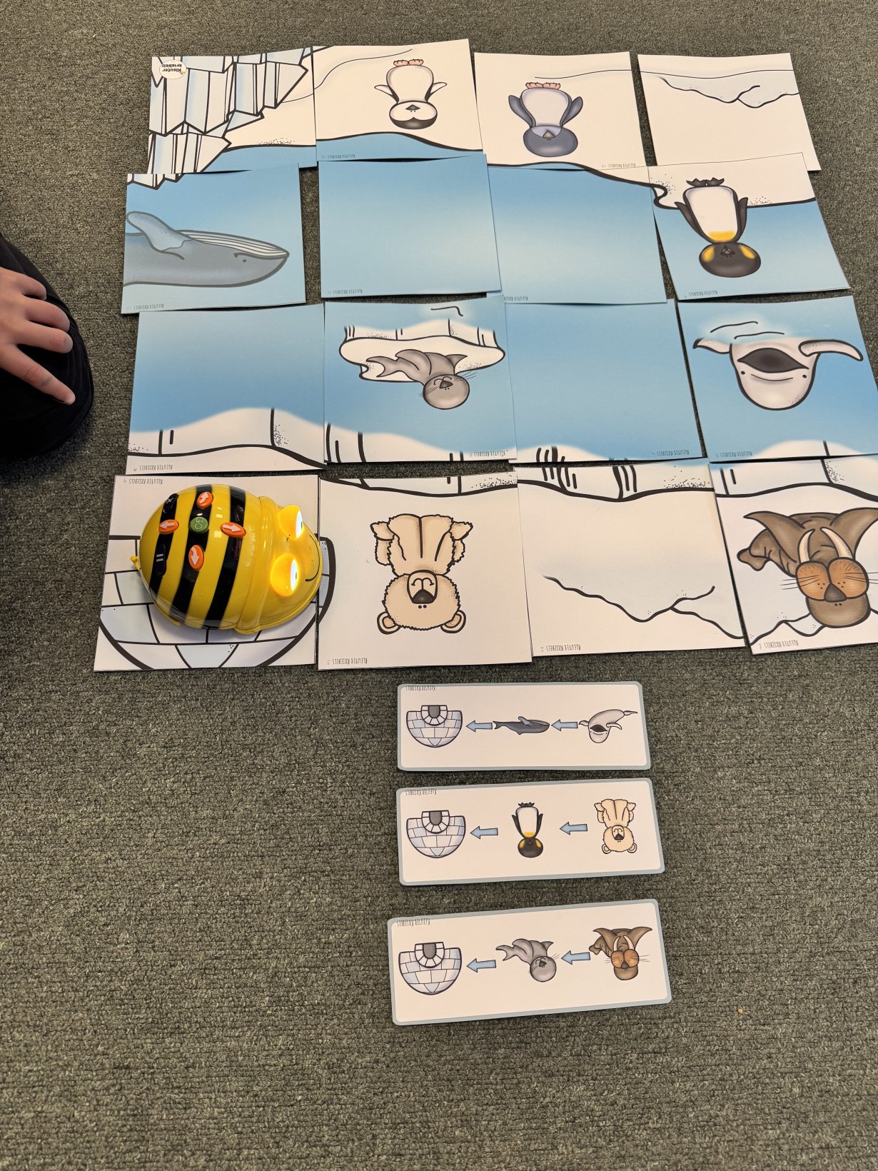 Ταξιδέψαμε στους πάγους και γνωρίσαμε τα πολικά ζώα. Μιλήσαμε για το περιβάλλον στο οποίο ζουν, πώς προστατεύονται από το κρύο, τι τρώνε και αναφερθήκαμε στον κύκλο ζωής του πιγκουίνου. Με τη βοήθεια του Bee-Bot, προγραμματίσαμε διαδρομές σε χειμωνιάτικα χαλάκια, δίνοντας εντολές και καλλιεργώντας τη λογική σκέψη και τον προσανατολισμό μας στον χώρο.