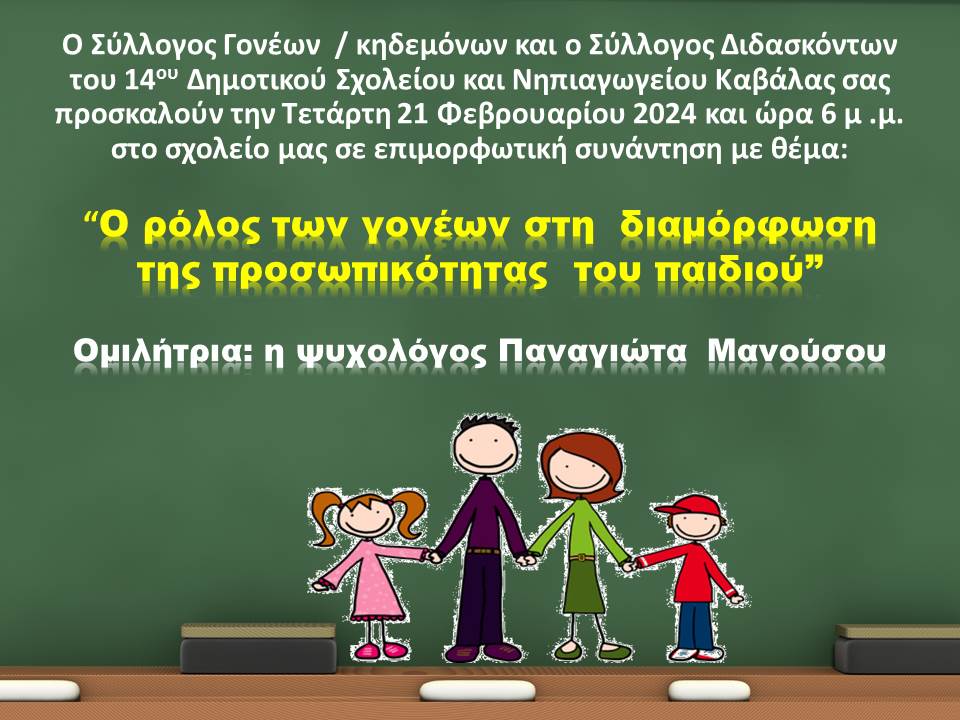 Από την χθεσινή εκδήλωση με θέμα τον ρόλο των γονέων στην διαμόρφωση της προσωπικότητας του παιδιού.Οι γονείς που παραβρέθηκαν μπόρεσαν να ενημερωθούν σε θέματα διαπαιδαγώγησης των παιδιών τους και να λύσουν πολλές απορίες τους.Ευχαριστούμε την ψυχολόγο κ. Γιώτα Μανούσου για την προσφορά της,καθώς και τους γονείς/κηδεμόνες που τίμησαν με την παρουσία τους την εκδήλωση…