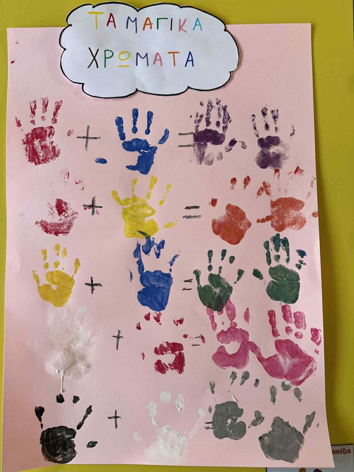 Δουλεύοντας πάνω στα χρώματα, κάναμε πολλά «πειράματα» με τα χρώματα: ανακατέψαμε μπογιές, δοκιμάσαμε μίξεις και ανακαλύψαμε πώς γεννιούνται νέα χρώματα.