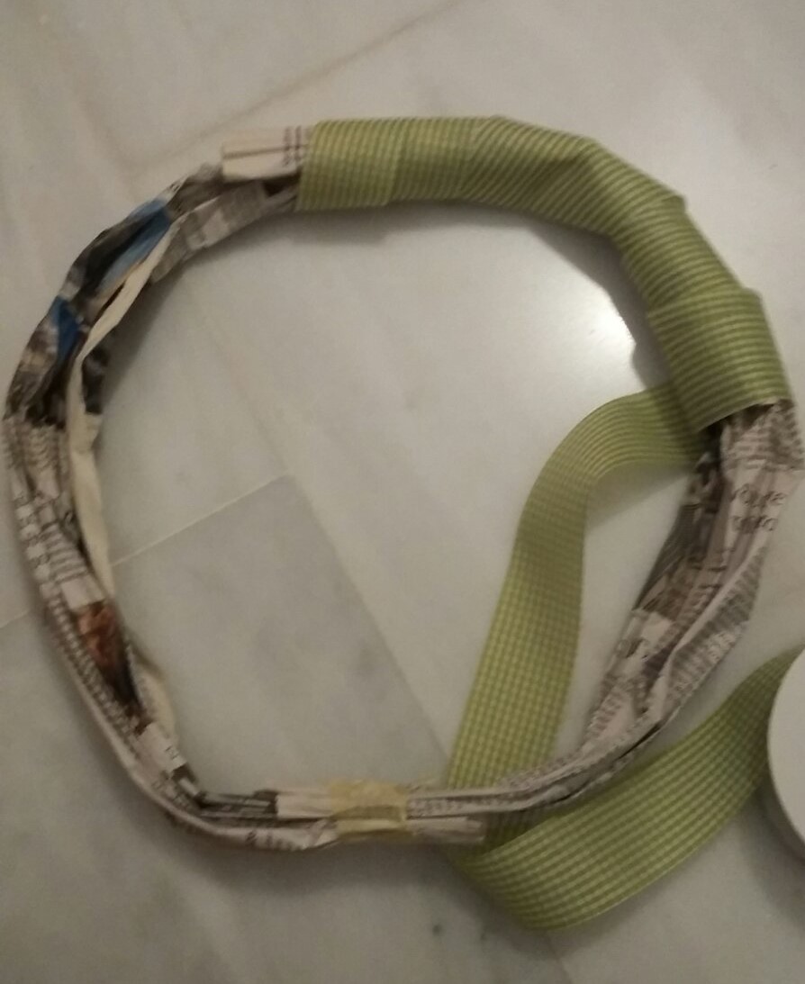 - Χρησιμοποιώ σελίδες από περιοδικό ή εφημερίδα (ότι έχω στο σπίτι) και φτιάχνω ένα στεφάνι από αυτές. Να είναι αρκετά παχύ για να μπορέσουμε να κολλήσουμε επάνω τα λουλούδια.