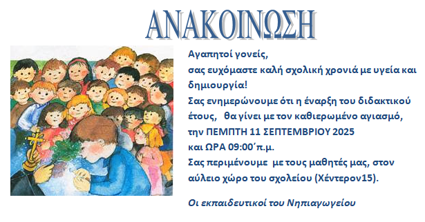 Οι εγγραφές μαθητών για το σχολικό έτος 2025-2026 θα γίνουν από 5-3-2025 έως και 31-3-2025 και θα εγγραφούν υποχρεωτικά τα παιδιά που έχουν γεννηθεί το 2021.