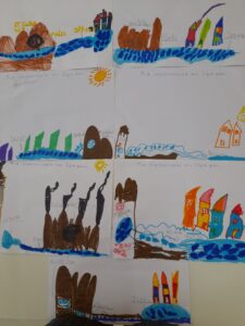 Στη συνέχεια τα παιδιά, μέσα από τη ζωγραφική, προσπάθησαν να δώσουν σχήμα και μορφή σε όσα είδαν στο παραμύθι.