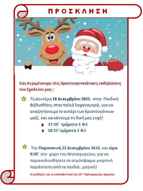 Πρόσκληση στις Χριστουγεννιάτικες Εκδηλώσεις του Νηπιαγωγείου Δημοσιεύθηκε στις 11 Δεκεμβρίου 2023 από τον/την 15ο ΝΗΠΙΑΓΩΓΕΙΟ ΑΓΡΙΝΙΟΥ.