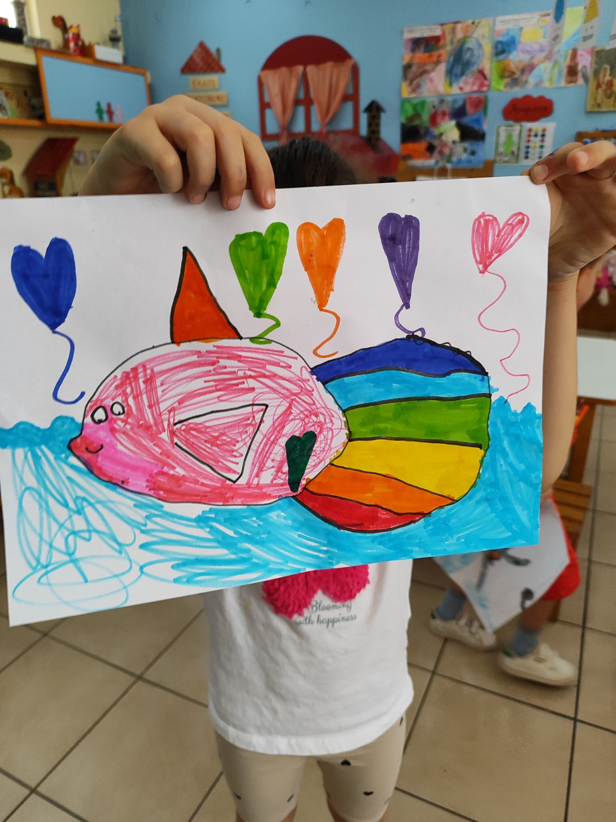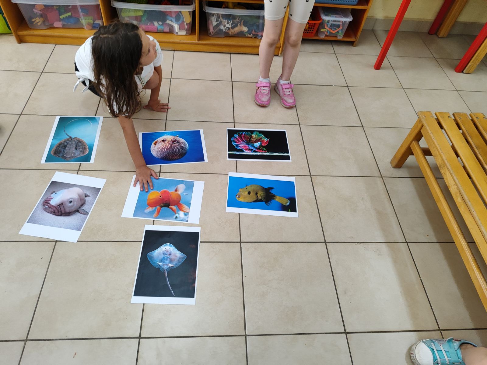 Παιχνίδι με ψαράκια, σκοπός να κολλήσουν στο ψάρι τους στην πλάτη ενός άλλου παιδιού και να μην μαζέψουν πολλά στην δική τους πλάτη.