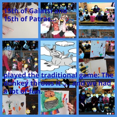 Ο Μάρτιος έρχεται η σειρά των γονέων ,τα παιδιά τους παίρνουν συνέντευξη για τα παιχνίδια που έπαιζαν στην παιδική τους ηλικία, παίζουν το αγαπημένο τους παιχνίδι ,το φωτογραφίζουν ,καταγράφουν σε ένα χαρτί το όνομα και τους κανόνες, Τα παιδιά ζωγραφίζουν το παιχνίδι και το κολάζ του κάθε σχολείου από τη δράση αυτή το ανεβάζουν σε ένα wakelet. Σε δεύτερη φάση επιλέγουν ένα γονικό παιχνίδι άλλου σχολείου το παίζουν , το φωτογραφίζουν και δημιουργείται ένα συνεργατικό ηλεκτρονικό βιβλίο. Ο Απρίλιος στην εξ αποστάσεως λειτουργία των σχολείων και για να γιορτάσουμε την ημέρα βιβλίου, κάθε σχολείο δημιουργεί μία κάρτα με το δικό της παραμύθι με ερωτήσεις πάνω στο παραμύθι και μια δραστηριότητα παιχνιδιού σχετική με το παραμύθι. Οι κάρτες παραμυθιών αναρτώνται σε ένα συνεργατικό έγγραφο pptx και παίζεται από όλα τα μέλη του έργου. Έγινε αγαπημένη δράση των παιδιών ,γνώρισαν πολλά παραμύθια ,διασκέδασαν… Ο Μάιος μας βρίσκει ξανά στα σχολεία μας και τι καλύτερο από παιχνίδια στην αυλή. Let`s play every day! ,χαρά ,δημιουργία ,χαμόγελα, ενθουσιασμό και πολλά άλλα συναισθήματα αποτυπώθηκαν στα κολάζ που αναρτήθηκαν σε padlet στο twinspace.