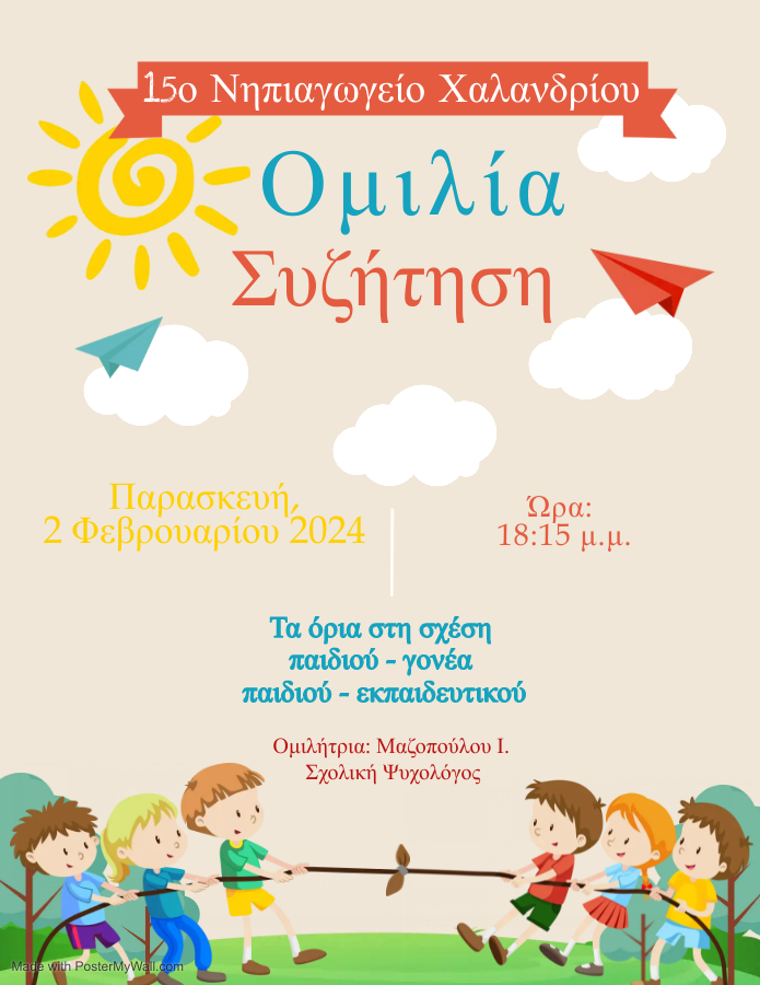 Την Παρασκευή 2 Φεβρουαρίου 2024 και ώρα 18:15 μ.μ. θα διεξαχθεί στο χώρο του Νηπιαγωγείου μας ομιλία – συζήτηση από τη Σχολική Ψυχολόγο του σχολείου μας, κα Ιοκάστη Μαζοπούλου, με θέμα τα όρια στη σχέση του παιδιού – γονέα και παιδιού – εκπαιδευτικού.