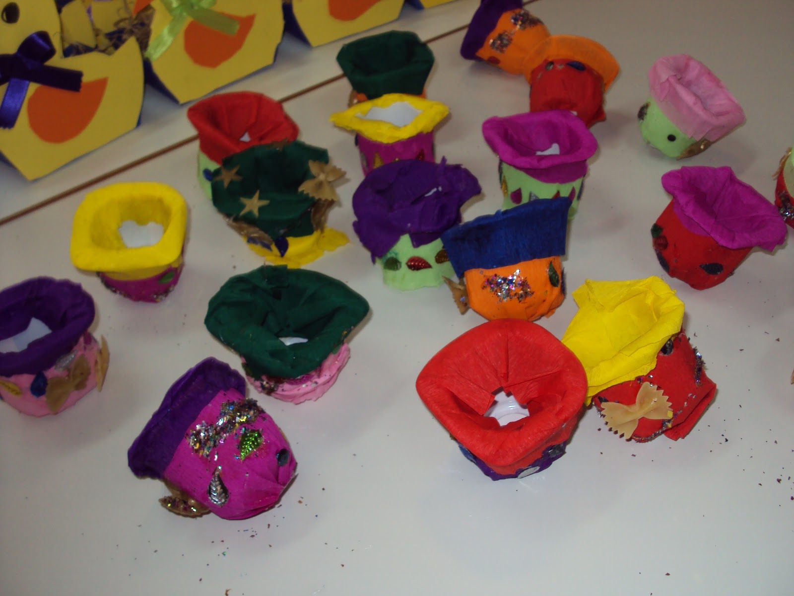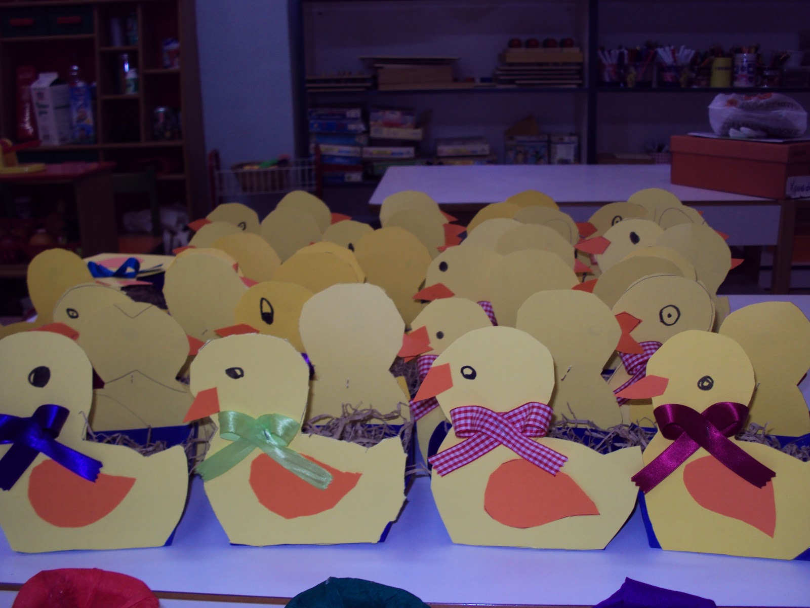 Οι κατασκευές μας το 2010 και το 2011 ζωγραφισμένα αυγά με διάφορα σχήματα μετά κολλάμε στο κανσόν αυγοθήκες από γιαουρτάκια καλαθάκια-παπάκια τα φαναράκια μας και το καλάθι-κότα κάρτες με αυγό από τσόφλια αυγού!