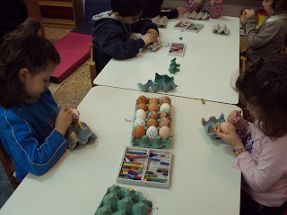 Ζωγραφίσαμε αυγά με κηρομπογιές και μετά τα βάψαμε με κόκκινη βαφή.