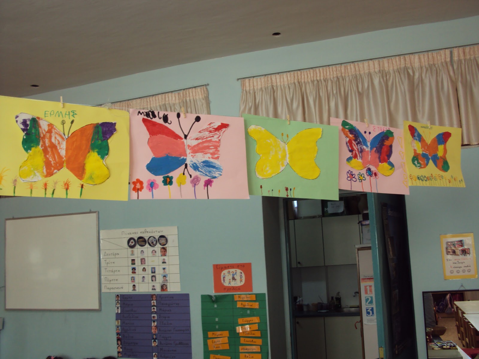 Σε διπλωμένο στη μέση Α4 είχαμε σχεδιάσει το ένα φτερό της πεταλούδας, τα παιδιά το γέμισαν με τέμπερες και μετά το διπλώσαμε απ’ την άλλη μεριά ώστε να βρεθεί το χρωματισμένο προς τα μέσα και να βγει το τύπωμα και στην άλλη πλευρά. Το ανοίγουμε να στεγνώσει και μετά το κόβουν και το κολλάνε σε άλλο Α4 και το στολίζουν όπως θέλουν!