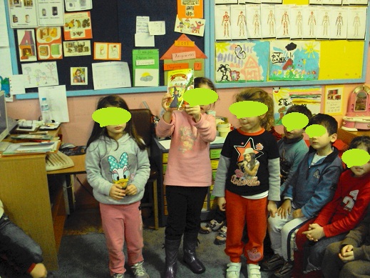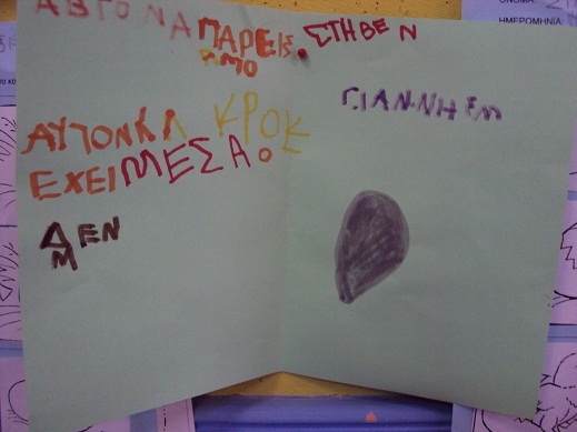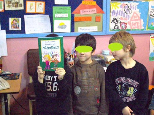 Πριν έρθει λοιπόν η συγγραγέας στο σχολείο παρατηρήσαμε βιβλία, το εξώφυλλο και το εσωτερικό και είδαμε πώς είναι αυτά. Μιλήσαμε για τον τίτλο (συνήθως) έχει τα πιο μεγάλα γράμματα, αυτόν που γράφει την ιστορία (τα παιδιά είπαν παραμυθάς, βιβλιογράφος…), τελικά τον συγγραφέα, αυτόν που κάνει τις εικόνες, εικονογράφος και για τον εκδότη, την ημερομηνία και την περίληψη στο οπισθόφυλλο.