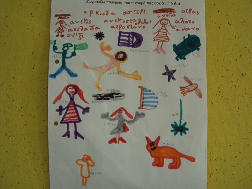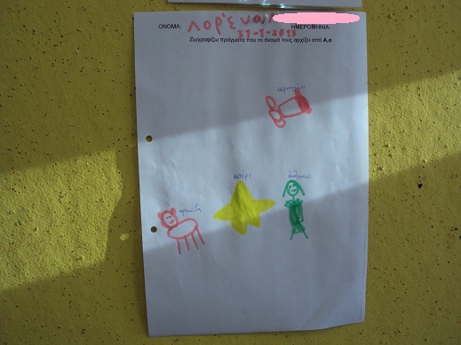 Με αφορμή το τραγούδι του χειμώνα (Α,α,α, αρχίζει η παγωνιά..), είπαμε λέξεις από Α,α, λέξεις που τελειώνουν σε -α, το γράψαμε, το ζωγραφίσαμε, το κυκλώσαμε… γενικά δεν το αφήσαμε σε “ησυχία” και τέλος ζωγραφίσαμε πράγματα που το όνομά τους αρχίζει από Α,α