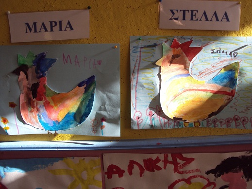 Οι κοτούλες μας …. συνεχίζουμε τα ζώα παράλληλα με τις απόκριες… Έκοψαν κότες από κανσόν, τις έβαψαν με νερομπογιές, μετά τις κόλλησαν σε Α4 και ζωγράφισαν τα πόδια και ό,τι άλλο ήθελαν τριγύρω.
