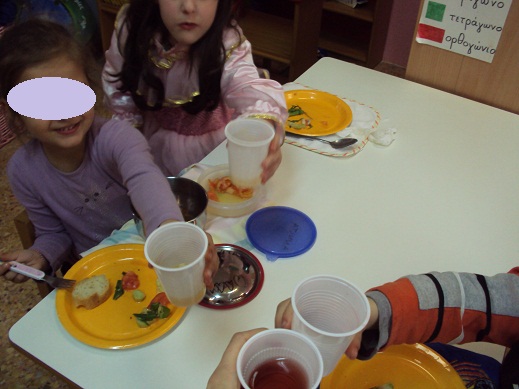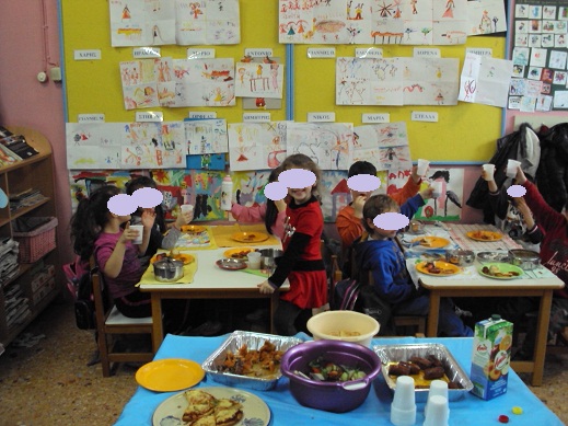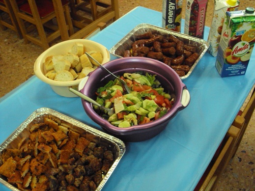 Ετοιμάσαμε τα ταψιά μας, κόψαμε σαλάτα, ψωμάκι, ετοιμάσαμε ποτήρια, πιάτα, χυμούς και περιμέναμε να ψηθούν!!! Περάσαμε όλοι μπροστά από την κουζίνα να “πάρουμε” μυρωδιά και ιδού, το τραπέζι μας.