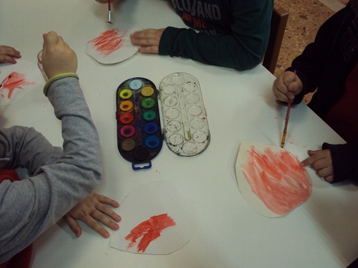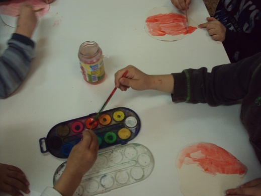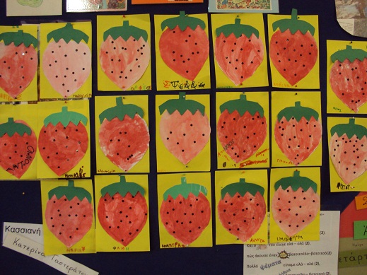 και μετά φτιάξαμε τις δικές μας. Έκοψαν το σχήμα της φράουλας σε χαρτονάκι, τις έβαψαν με νερομπογιές, κόλλησαν πούλιες για σποράκια και έτοιμες!!!