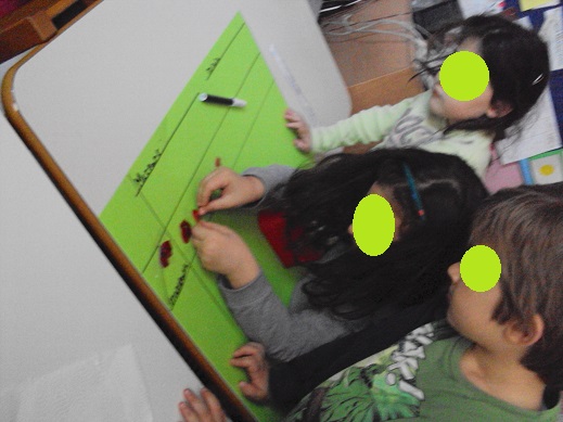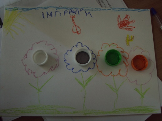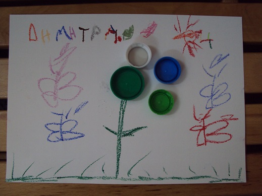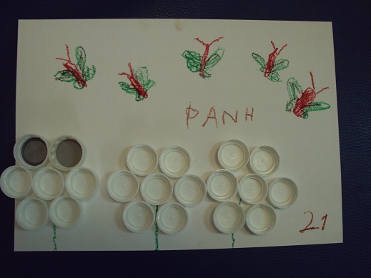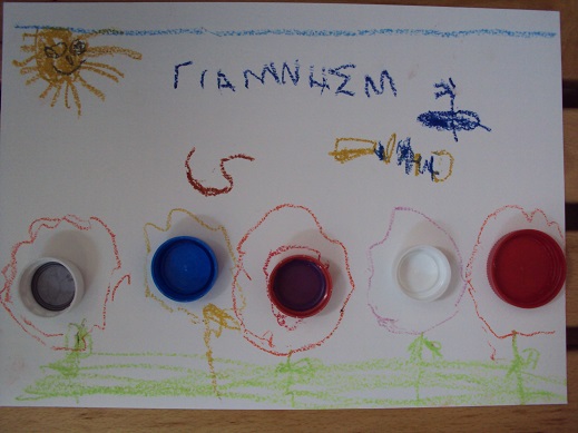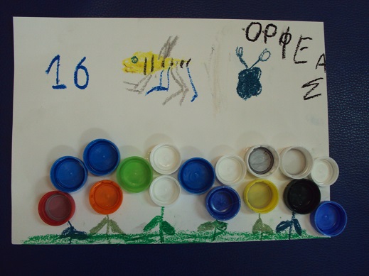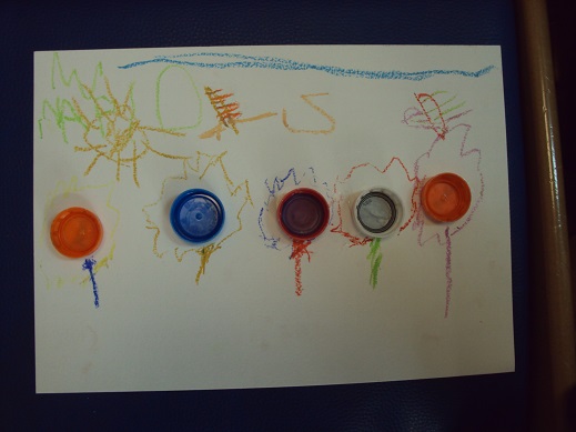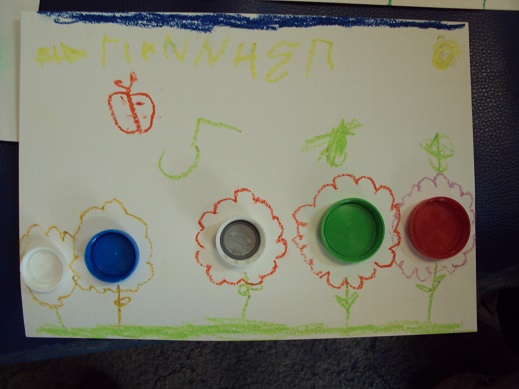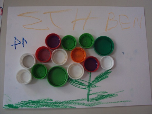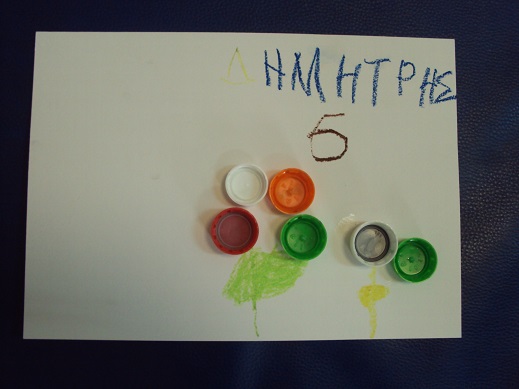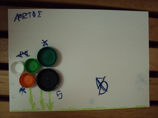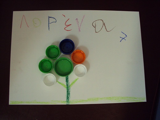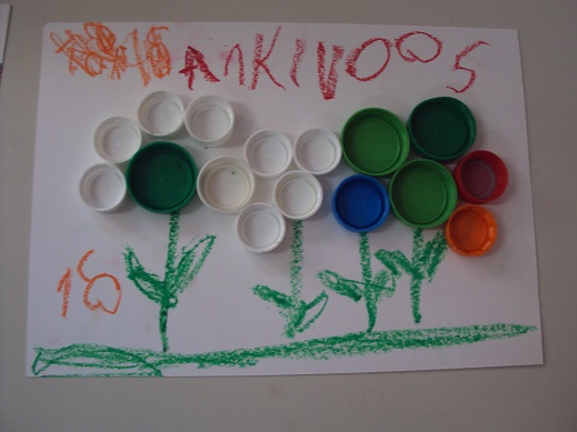Μετά τους έδωσα καπάκια από διάφορα μπουκάλια για να φτιάξουν τα δικά τους πρωτότυπα λουλούδια. Τα κόλλησαν όπως ήθελαν και στο τέλος μέτρησαν και έγραψαν πόσα καπάκια χρησιμοποίησαν.