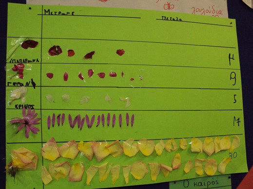 Επεξεργάστηκαν λοιπόν τα λουλούδια, μίλησαν για τα μέρη των λουλουδιών, τα ονόμασαν και παρατήρησαν ότι το κάθε λουλούδι, εκτός των άλλων, διαφέρει στον αριθμό των πέταλων.