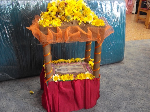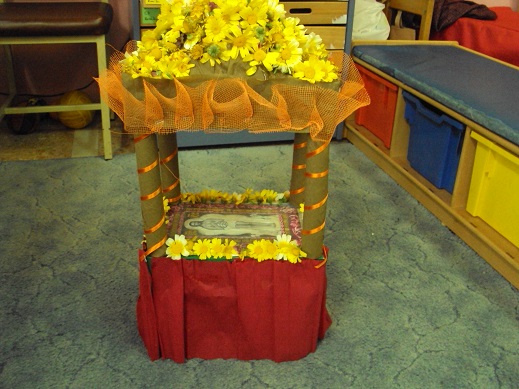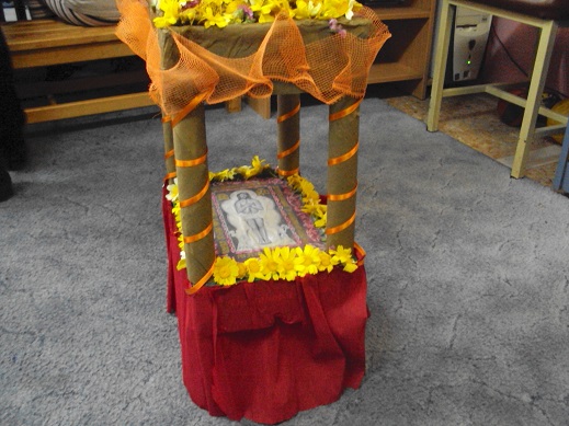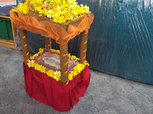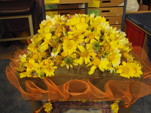 Τις τελευταίες μέρες μερικά παιδιά είχαν φέρει λουλούδια στην τάξη και σκέφτηκα, μια και αύριο κλείνουμε για τις διακοπές μας, να τα χρησιμοποιήσουμε δημιουργικά, παρά να τα πετάξουμε “εν ψυχρώ”. Κουβεντιάσαμε και είπαμε ότι λουλούδια χρησιμοποιούνται στη Μ. Εβδομάδα για το στόλισμα του Επιταφίου, έτσι αποφασίσαμε να φτιάξουμε έναν δικό μας στην τάξη.
