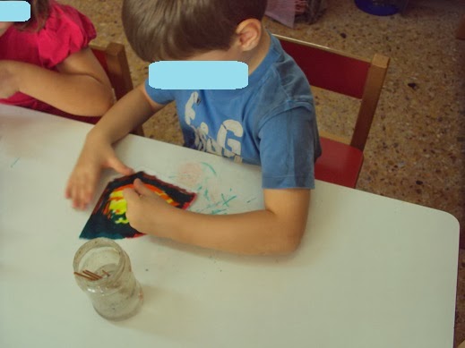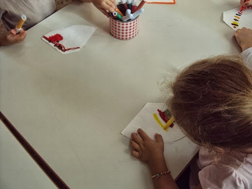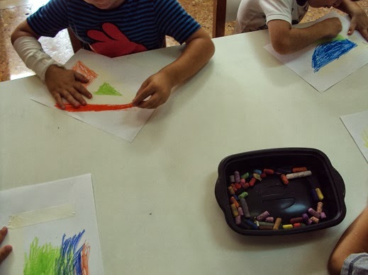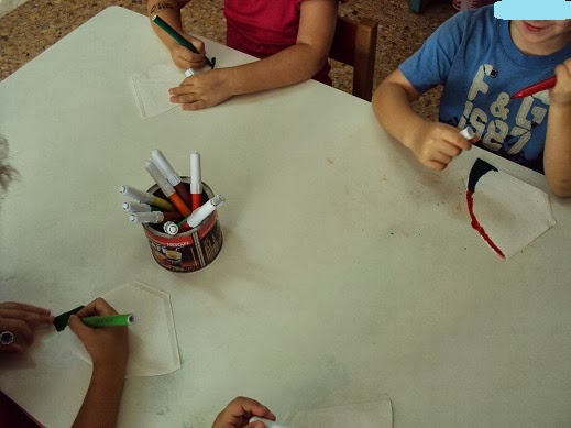 Τα παιδιά ζωγράφισαν τα φίλτρα με φθινοπωρινά χρώματα, μετά τα πέρασαν με λίγο νερό και όταν στέγνωσαν τα έκοψα σε φυλλαράκια.