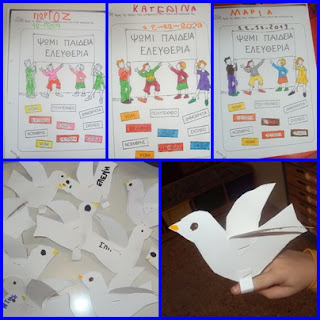 αλλά για τη Γλώσσα, ξεχωρίζοντας τις λέξεις, ΨΩΜΙ, ΠΑΙΔΕΙΑ, ΕΛΕΥΘΕΡΙΑ. Φτιάξαμε και το περιστέρι της Ειρήνης