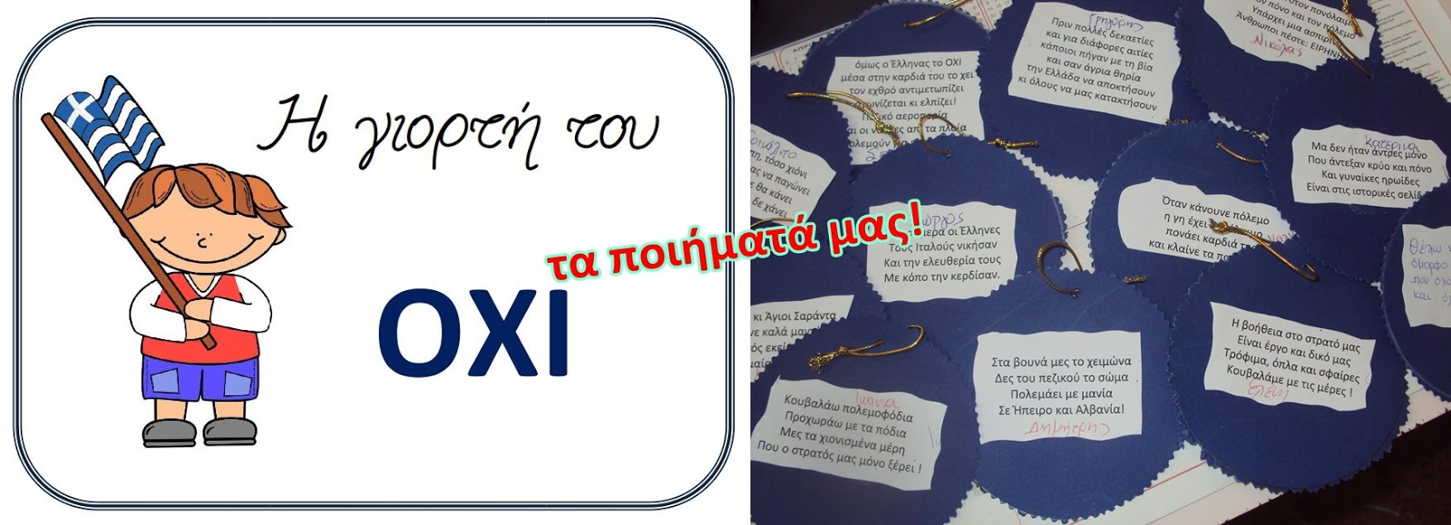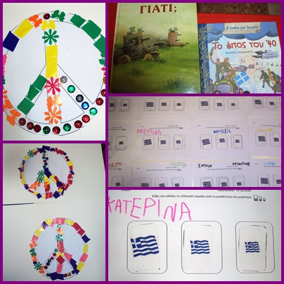 Διαβάσαμε “το έπος του ’40”, του Φίλιππου Μανδηλαρά, φτιάξαμε το σήμα της ειρήνης και σειροθετήσαμε σημαίες από τη μεγαλύτερη στη μικρότερη. Φυσικά πραγματοποιήθηκε και η πρώτη γιορτούλα μας.