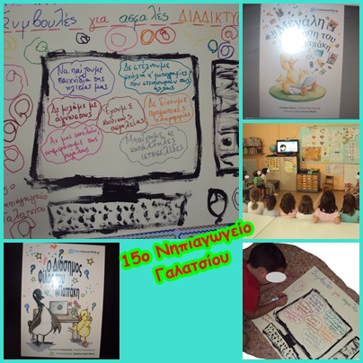 Παρακολουθήσαμε με τα παιδιά τα βίντεο από το Ελληνικό Κέντρο Ασφαλούς Διαδικτύου και συζητήσαμε για τους κινδύνους στο διαδίκτυο και το τι πρέπει να προσέχουμε. Διαβάσαμε, επίσης, τα βιβλία του Παπάκη. Γράψαμε τα μηνύματά μας στην οθόνη του υπολογιστή και το “στολίσαμε”, ζωγραφίζοντας “παπάκια” @
