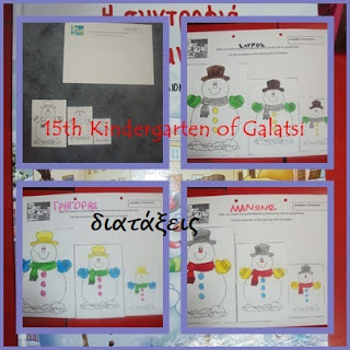 Με αφορμή το βιβλίο, “Η συντροφιά των χιονανθρώπων”, φτιάξαμε χιονάνθρωπους από χάρτινα πιάτα και τους ομαδοποιήσαμε με ένα ή δυο κριτήρια (καπέλο, κασκώλ, μύτη κ.λ.π.)