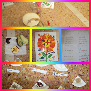 Πριν κλείσουμε είχαμε μιλήσει και ασχοληθεί με τη σπορά. Διαβάσαμε το βιβλίο, Το σποράκι ταξιδεύει του Eric Carle, γίναμε κι εμείς σποράκια και μεγαλώσαμε όπως τα φυτά. Είπαμε τι χρειάζεται το φυτό για να αναπτυχθεί και βρήκαμε τη λέξη σπόρος.
