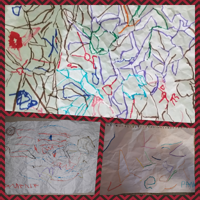 Τσαλακώσαμε χαρτιά και μετά σχεδιάσαμε με χρώματα πάνω στις γραμμές που δημιουργήθηκαν.