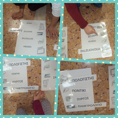 Ξεκινήσαμε λοιπόν με τα μέρη του υπολογιστή. Μαθαίνουμε τα μέρη του υπολογιστή. Ταυτίζουμε εικόνες και λέξεις και μετά βρίσκουμε την εικόνα στο χαλάκι του bee bot και το οδηγούμε στο αντίστοιχο τετράγωνο με τη λέξη που τραβήξαμε.