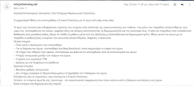 Συγχαρητήρια και πάλι για το παράδειγμα για όλα τα άλλα σχολεία: υπολογίζουμε στην αφοσίωση και τη δέσμευσή σας να προωθήσετε το eTwinning και τις αξίες του, οι οποίες αντιπροσωπεύονται από την αποστολή του eTwinning Schools την οποία μπορείτε να κατεβάσετε εδώ: https://www.etwinning.net /files/etwinningschool/etwinning_school_mission.pdf.